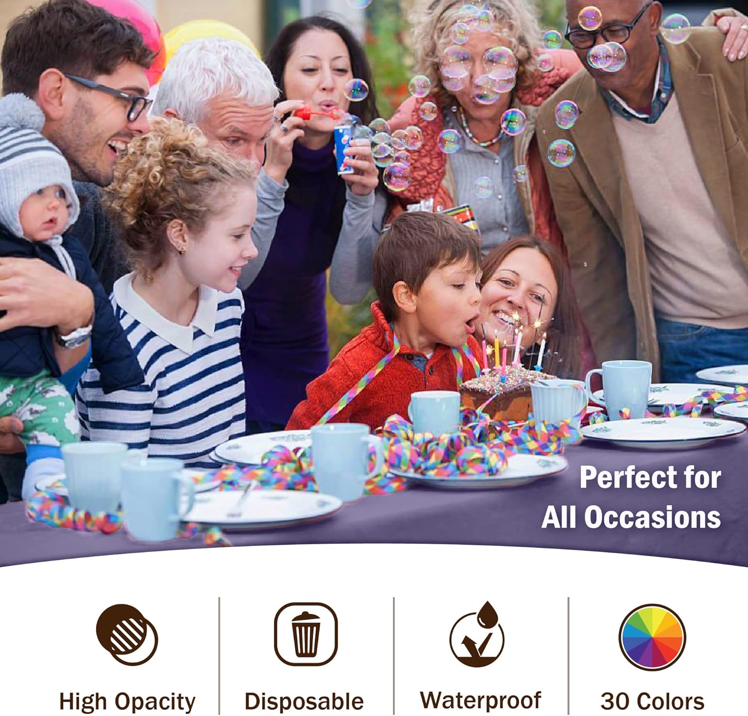 • HIGH OPACITY: covers any table with minimal transparency. Great plastic tablecoth for parties, weddings, holdiay party, , birthday parties, christmas, thanksgiving dinner, bbq, and any other color themed event.