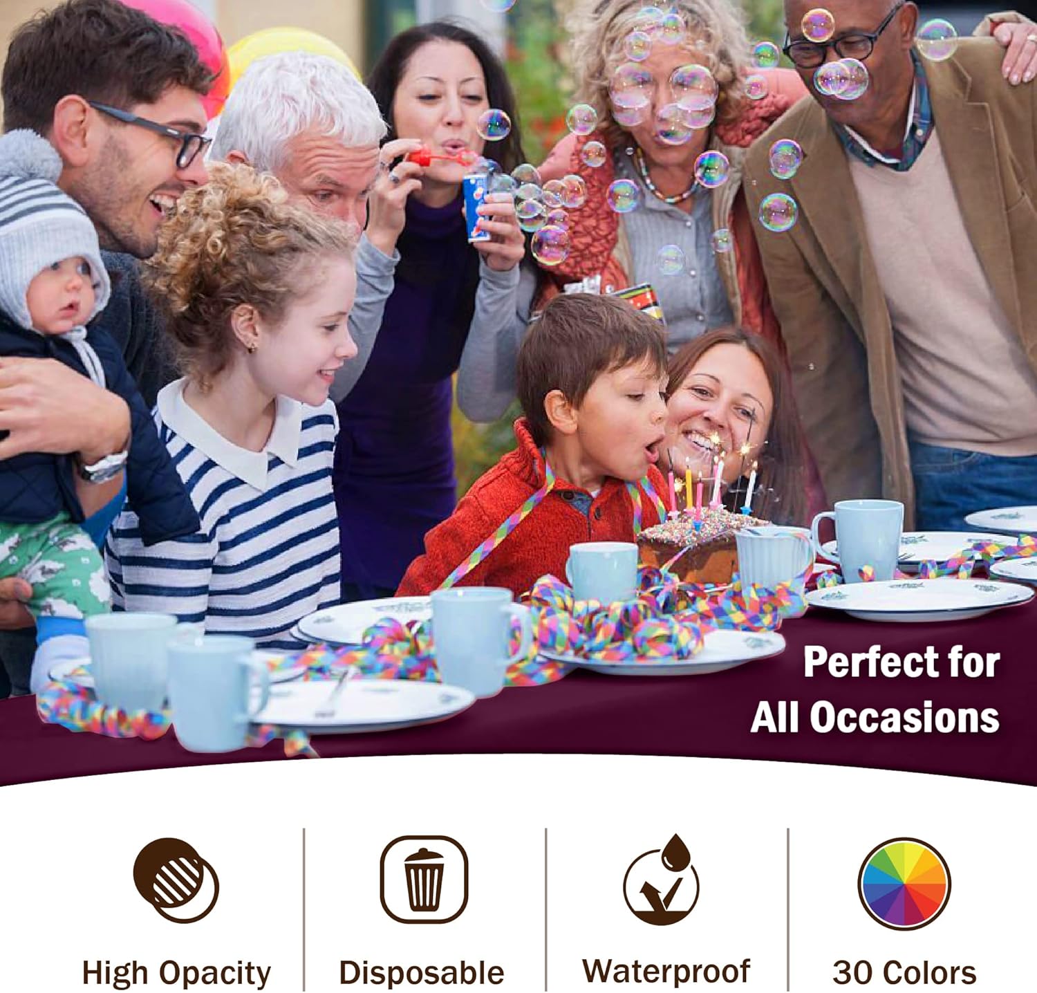 • HIGH OPACITY: covers any table with minimal transparency. Great plastic tablecoth for parties, weddings, holdiay party, , birthday parties, christmas, thanksgiving dinner, bbq, and any other color themed event.