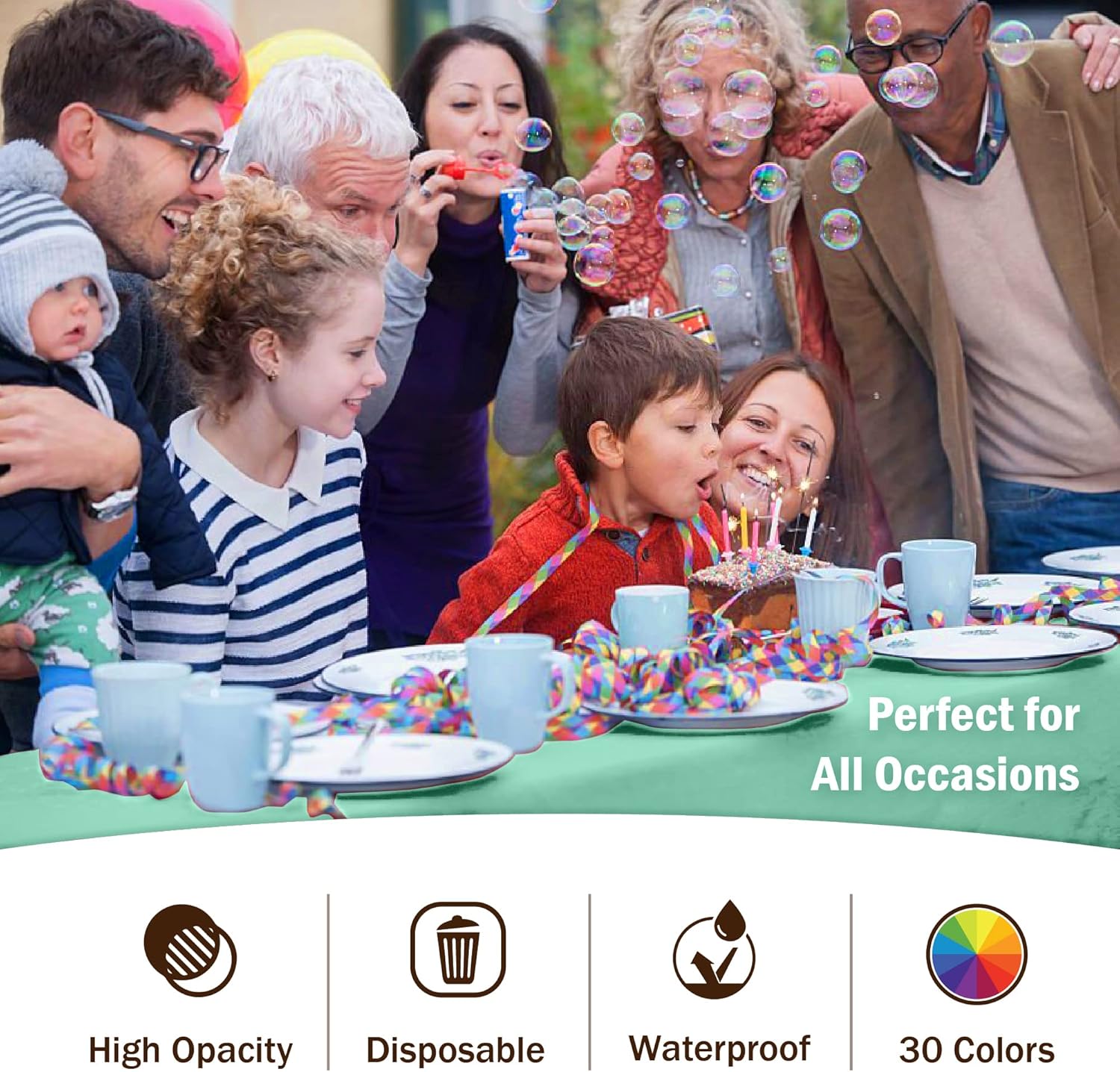 • HIGH OPACITY: covers any table with minimal transparency. Great plastic tablecoth for parties, weddings, holdiay party, , birthday parties, christmas, thanksgiving dinner, bbq, and any other color themed event.