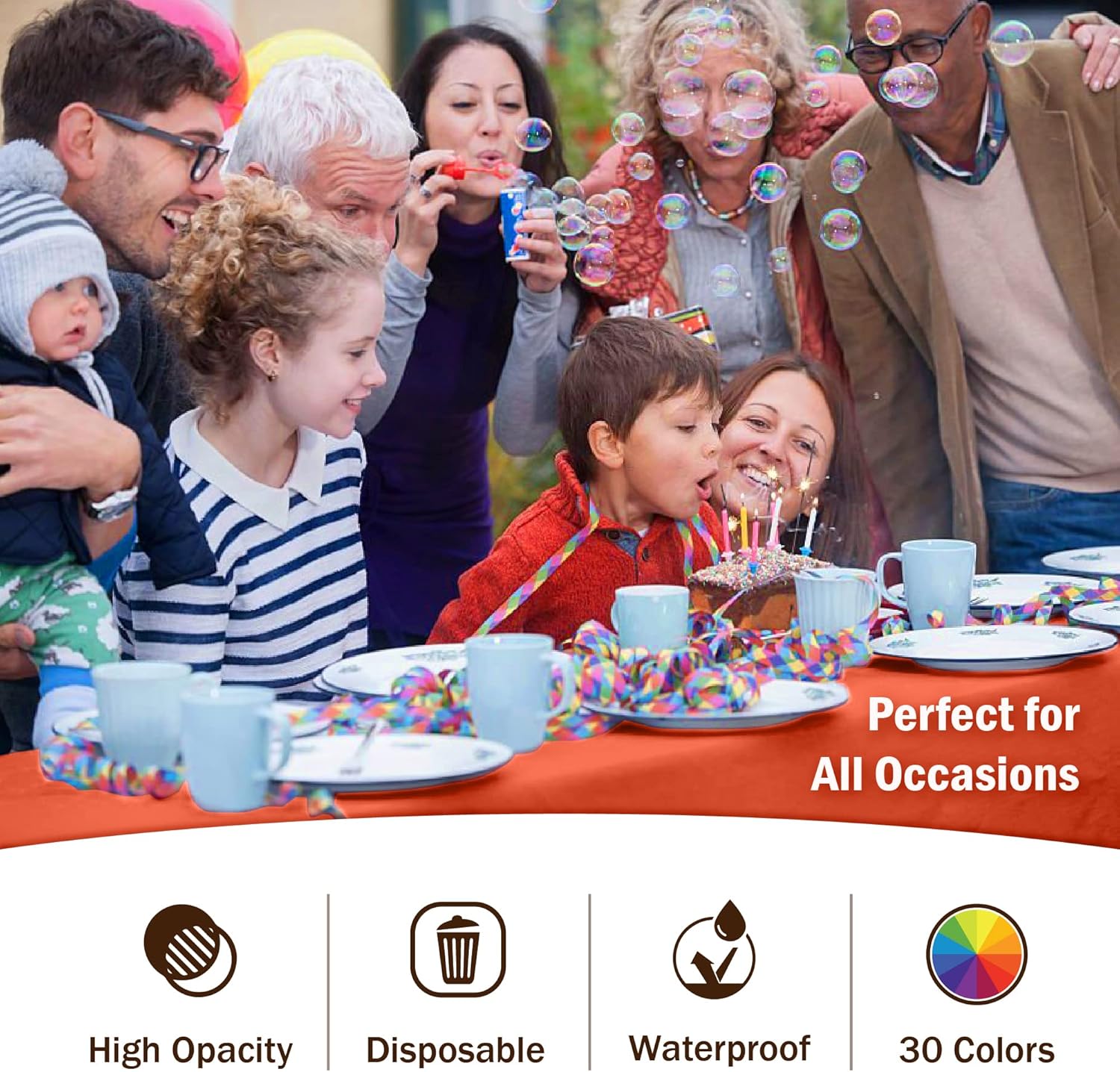 • HIGH OPACITY: covers any table with minimal transparency. Great plastic tablecoth for parties, weddings, holdiay party, , birthday parties, christmas, thanksgiving dinner, bbq, and any other color themed event.