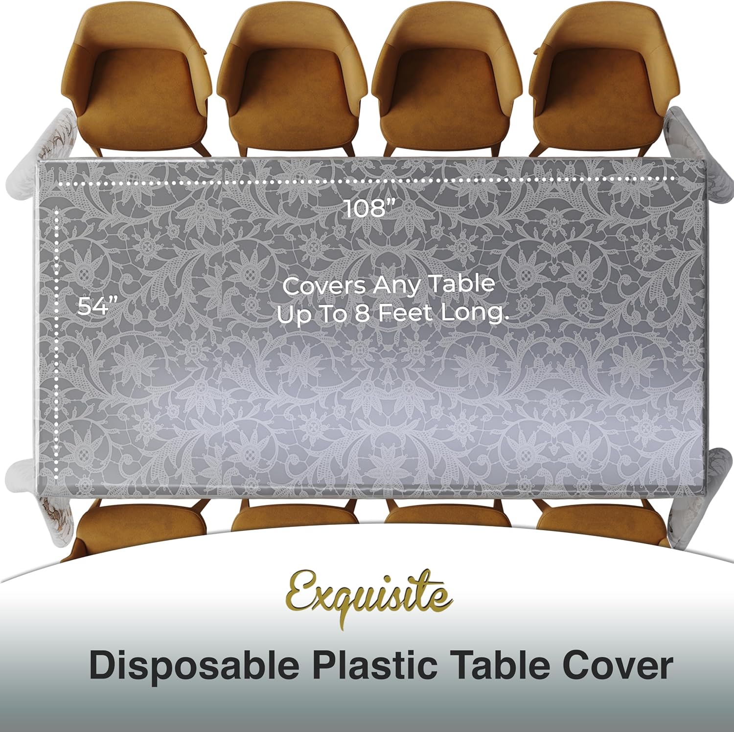 • Includes: This 12-pack of transparent silver lace table cloth rectangle table coverings offers elegant protection for your furniture. Each silver table cloth rectangle measures 54" X 108", making it ideal for standard tables. These clear plastic table cloth disposable covers combine functionality with beauty. Being disposable tablecloth yet fancy flower tablecloth at the same time.