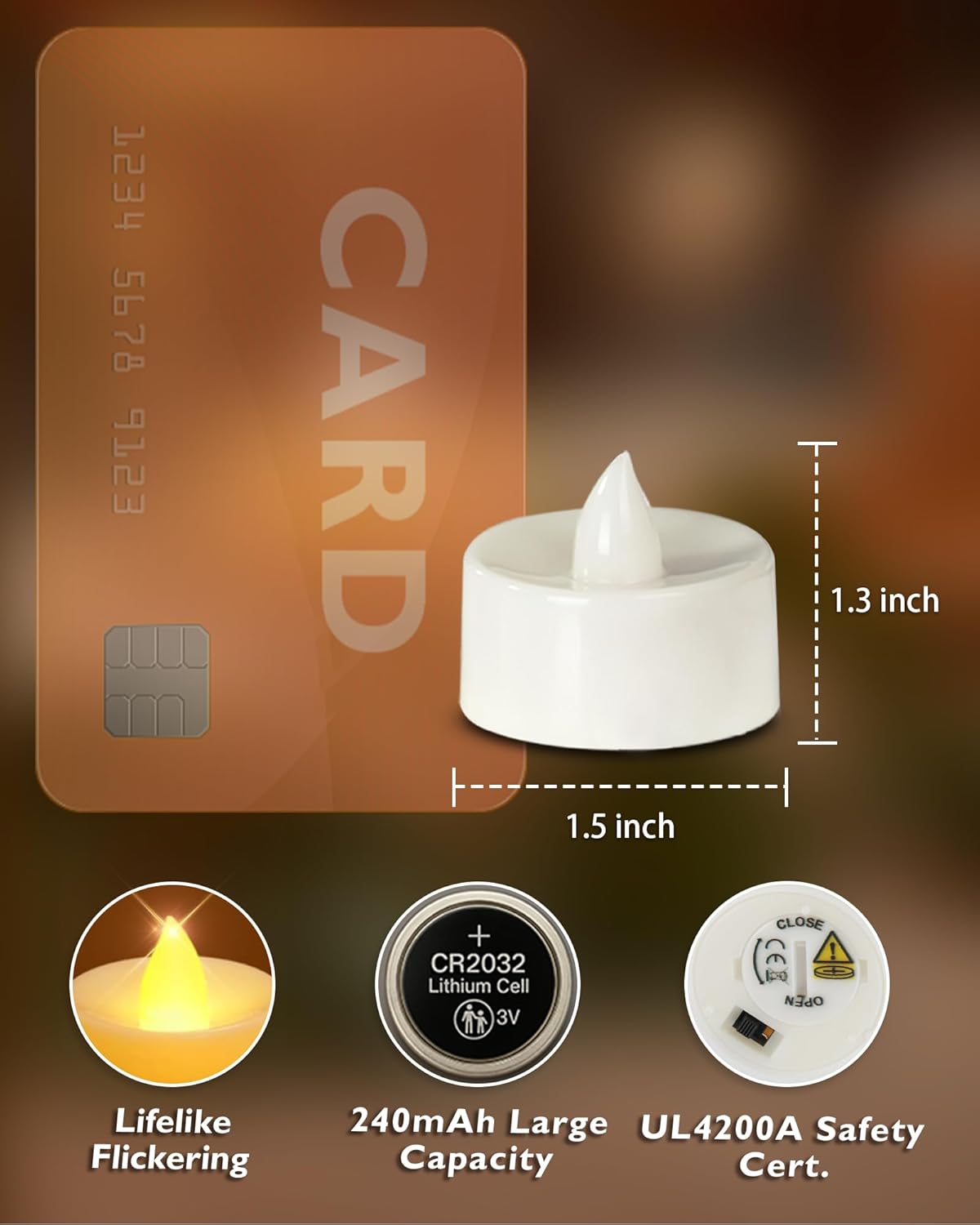 • VERSATILE: Sized at 1.5"Dia x 1.3"H, these electric tea lights fit most tea lights/votive holders and wall sconces. Perfect for adorning occasions such as weddings, parties, anniversaries, or festivities like Halloween and Christmas, they will undoubtedly amplify the joy and charm of any occasion