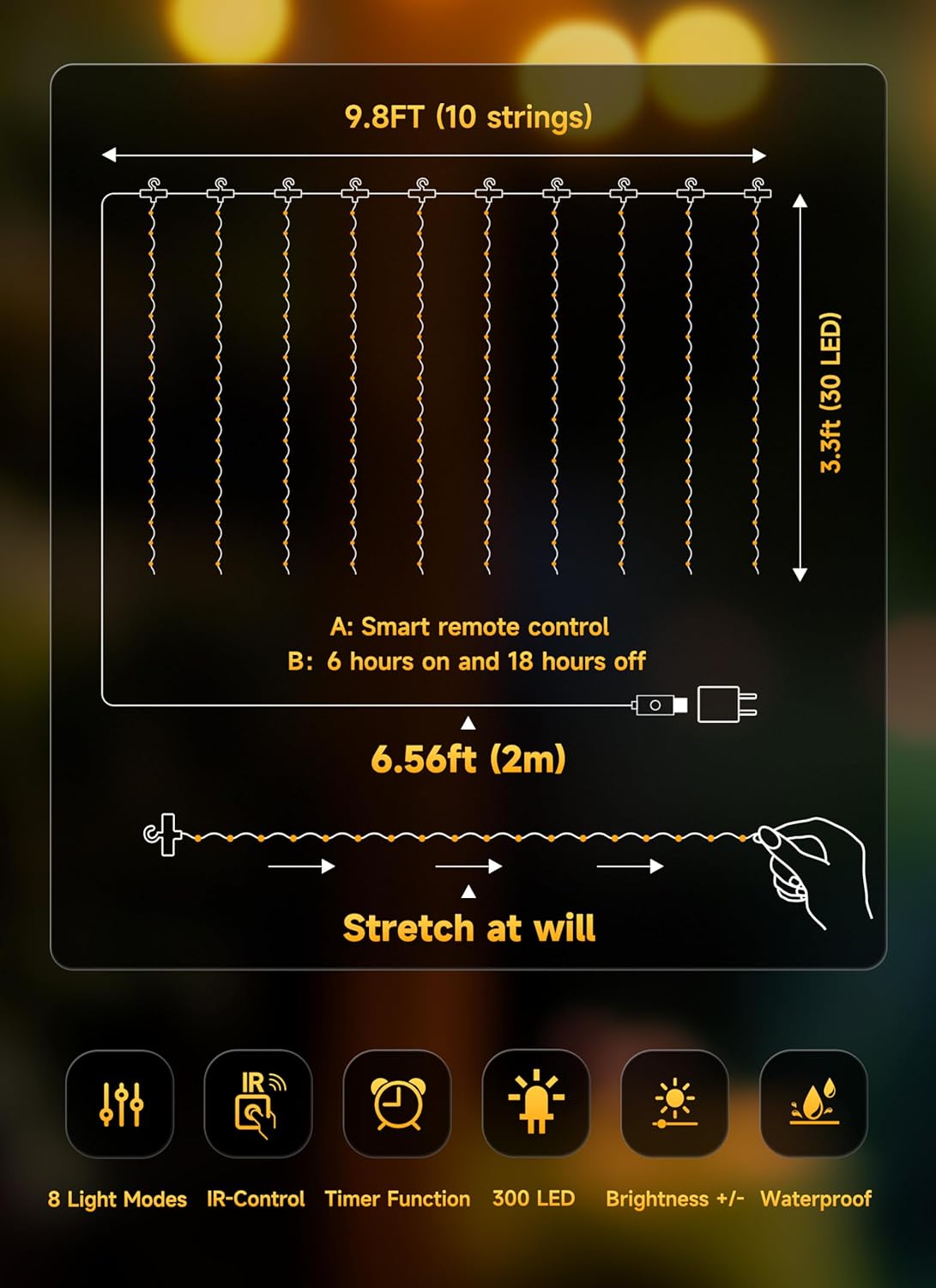 • 8 Modes & Memory Function - Brightown 9.8FT x 9.8FT curtain string lights include 300 warm white LEDs on 12 strands. Features 8 modes (Combination, Waves, Sequential, Slo-Glo, Chasing, Slow Fade, Twinkle, Steady On) and a memory function that restores the last mode after turning off.