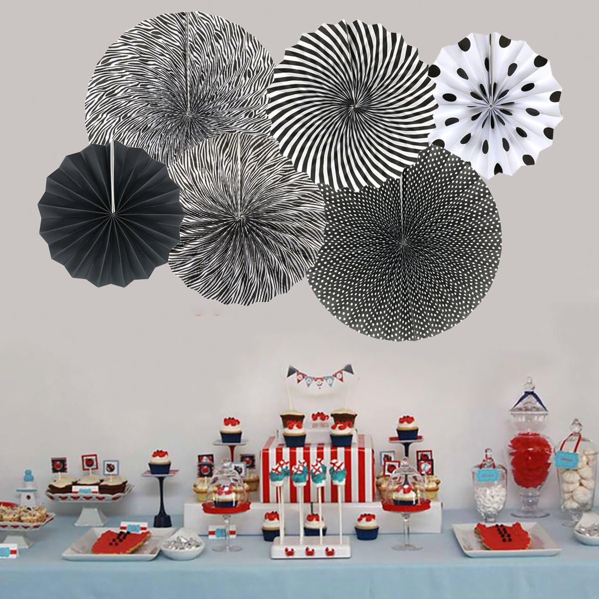 Party Hanging Paper Fans Set, Black Round Pattern Paper Garlands Decoration for Birthday Wedding Graduation Events Accessories, Set of 6