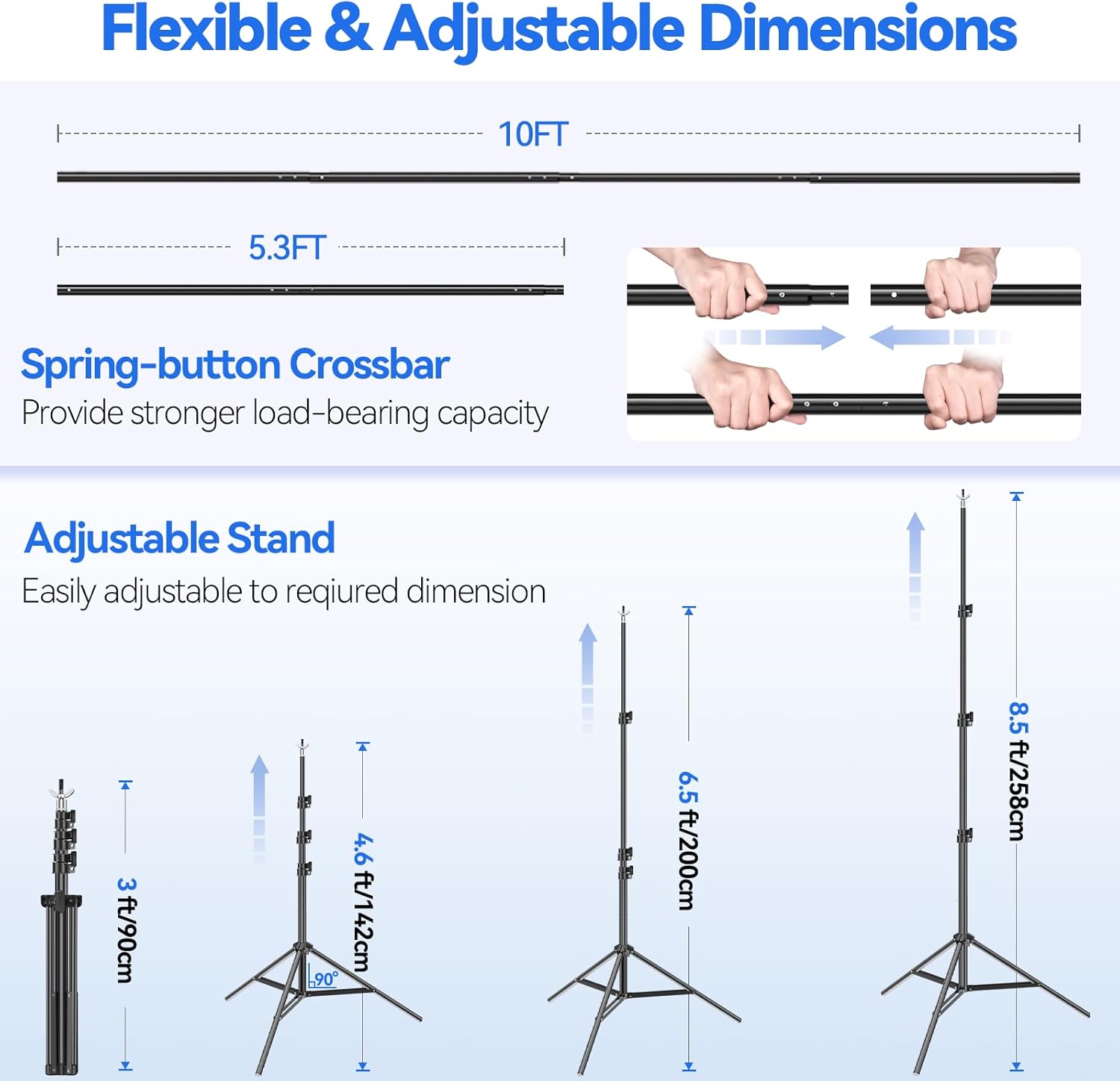 • Backdrop Support Stand: This kit is a professional support with Adjustable Height( Min 3 ft – Max 8.5 ft ) and Width( Min 5 ft – Max 10 ft ) Aluminum Alloy Construction for Durability, Portability. Can be assembled by one person in just a few minutes
