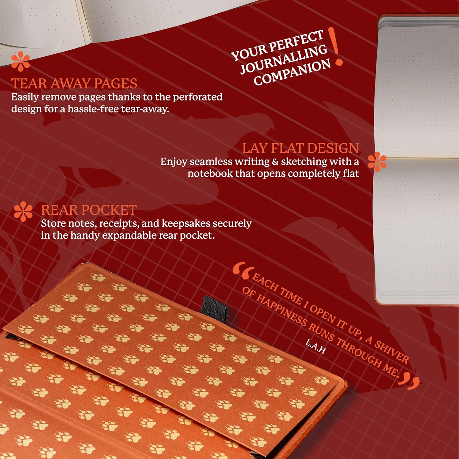 • A5 NOTEBOOK WITH LOTS O' FEATURES: Dingbats notebooks ooze quality - this hardcover bound leather notebook is crafted with PU vegan leather, micro-perforated cream 100gsm pages, an elastic closure and pen holder. It's complete with animal footprint end sheets, and an inner pocket for a little added detail - the perfect gifts for men and women, these travel essentials are a gift that keep on giving