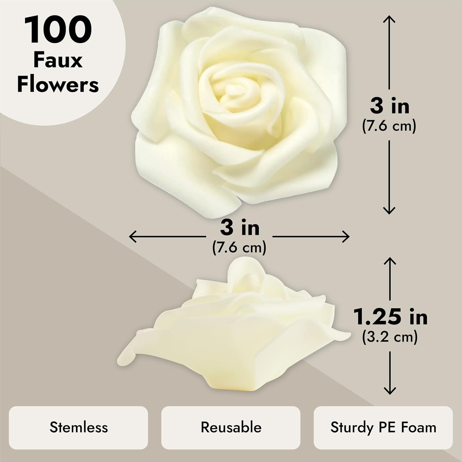 Juvale Centerpiece Table Decorations Ivory Artificial Roses - 100-Pack 3-Inch Foam Heads - Fake Flowers in Vase & Flower Decor - Wedding Table Decor & DIY Crafts