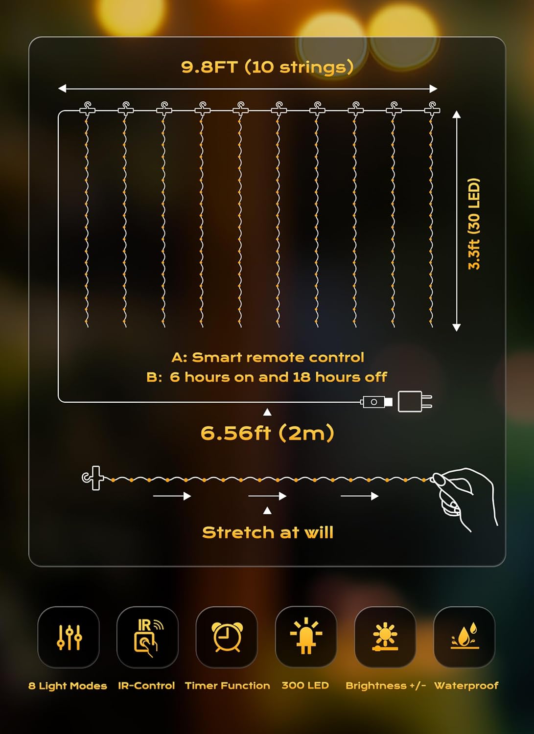 • Easy installation: Please do not unwrap the individual strings until you have set up the main string of lights. Lighted length: 9.8 feet times 9.8 feet. Adjust distance between strings with zip tie for a double layer to fit your needs and make the lights look better