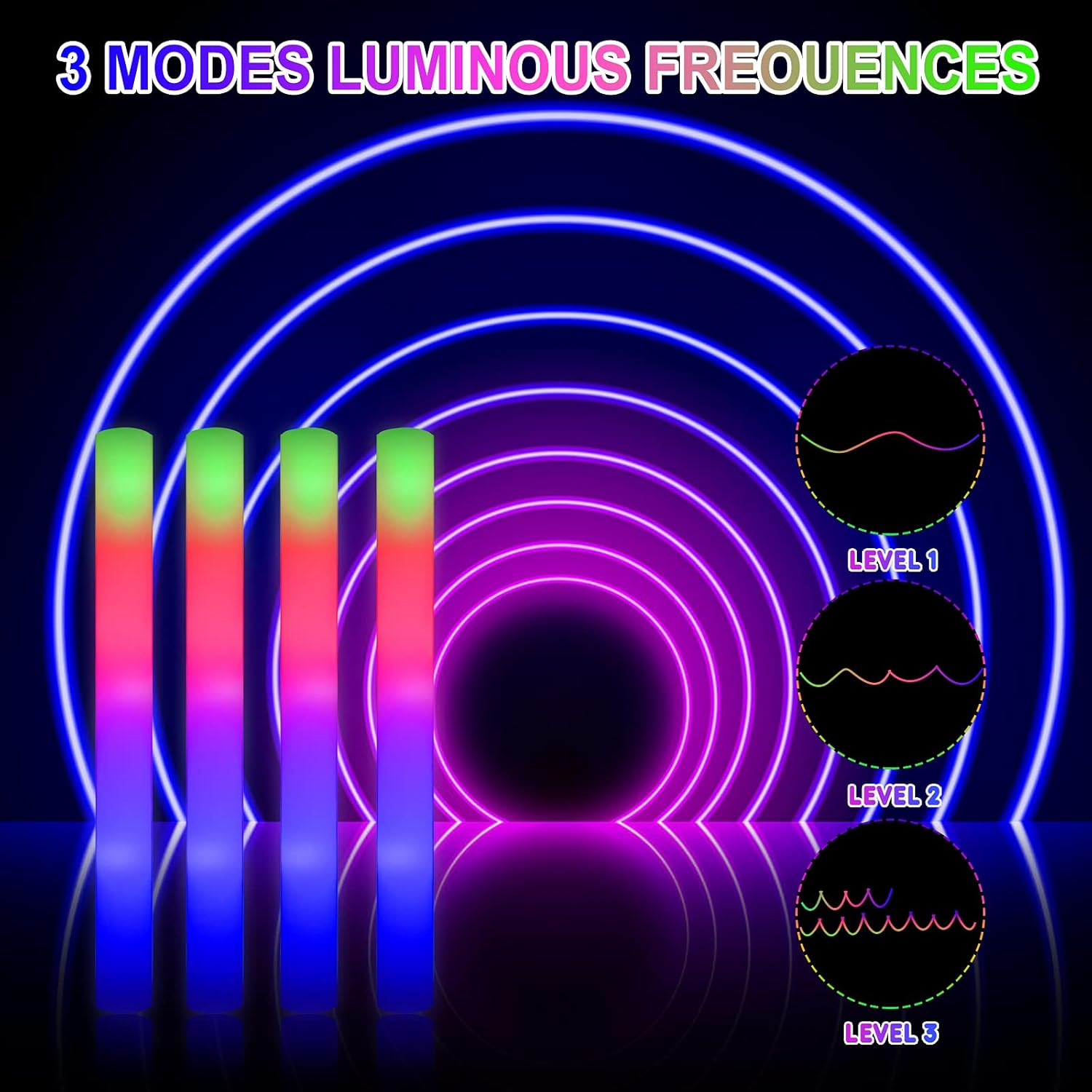 • 30pcs Glow Foam Sticks with 3 Flashing Modes: Press power button to switch between 3 different light up modes Quick flashing, Slow flashing, Alternately flashing in green red blue 3 light color