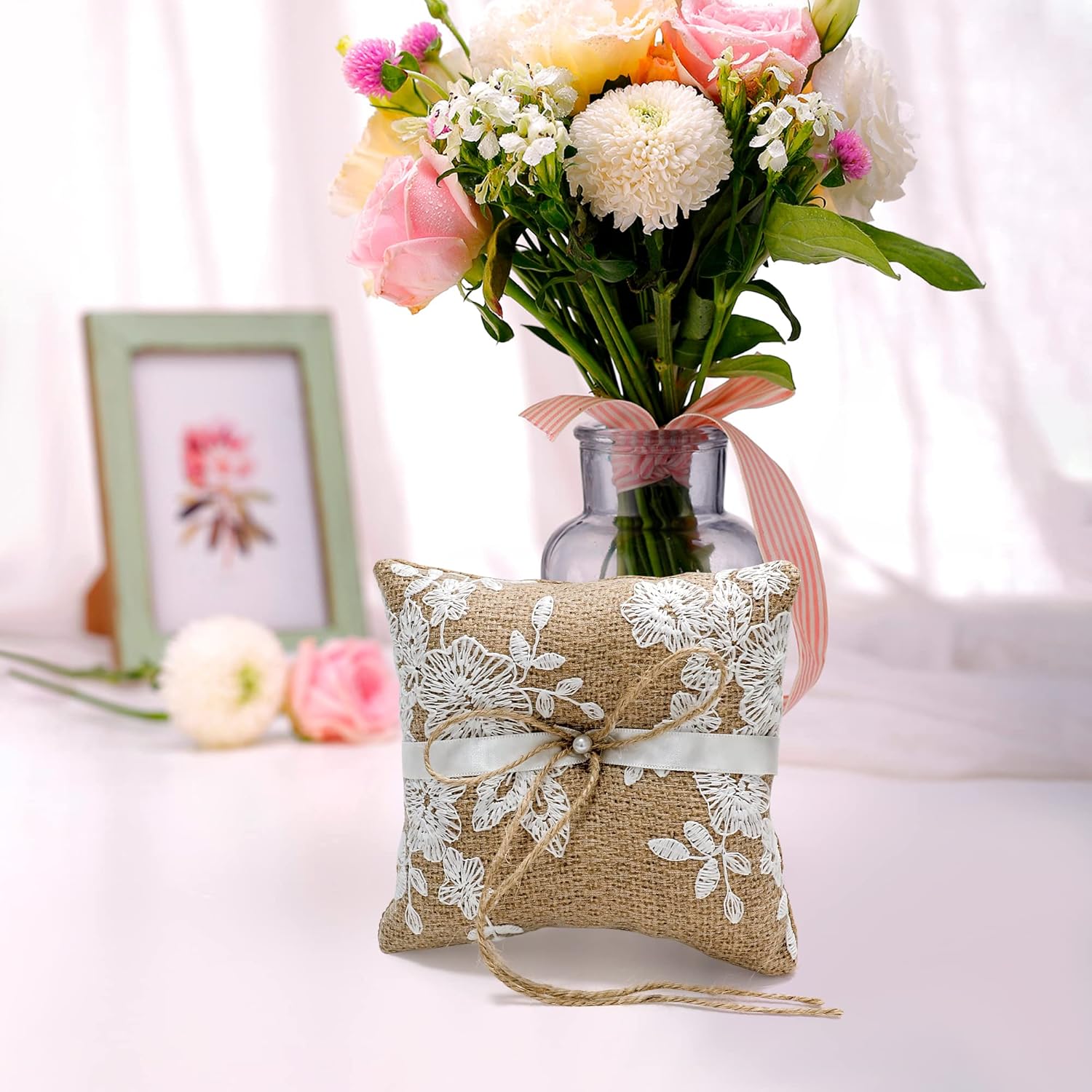 • ❄ Ring Bearer Pillows: Burlap ring bearer pillows cushion Size:5.9*5.9 inch. MATERIAL- Burlap, lace. Rustic shabby retro wedding ring pillow is decorated with middle white embroidered floral lace trim and bowknot.