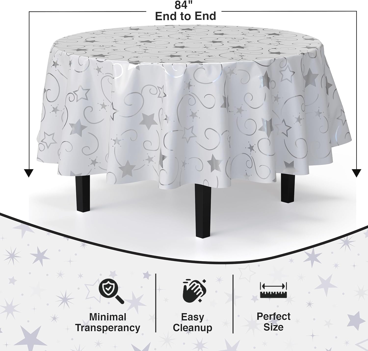 • Includes: This 12-pack of Silver Star on white back Tablecloths comes with Disposable round Tablecloths measuring 84". These round Table Covers are perfect tablecloths for round tables, offering a stylish Silver Star Table cloths design for any celebration, keeping your tables clean and protected.