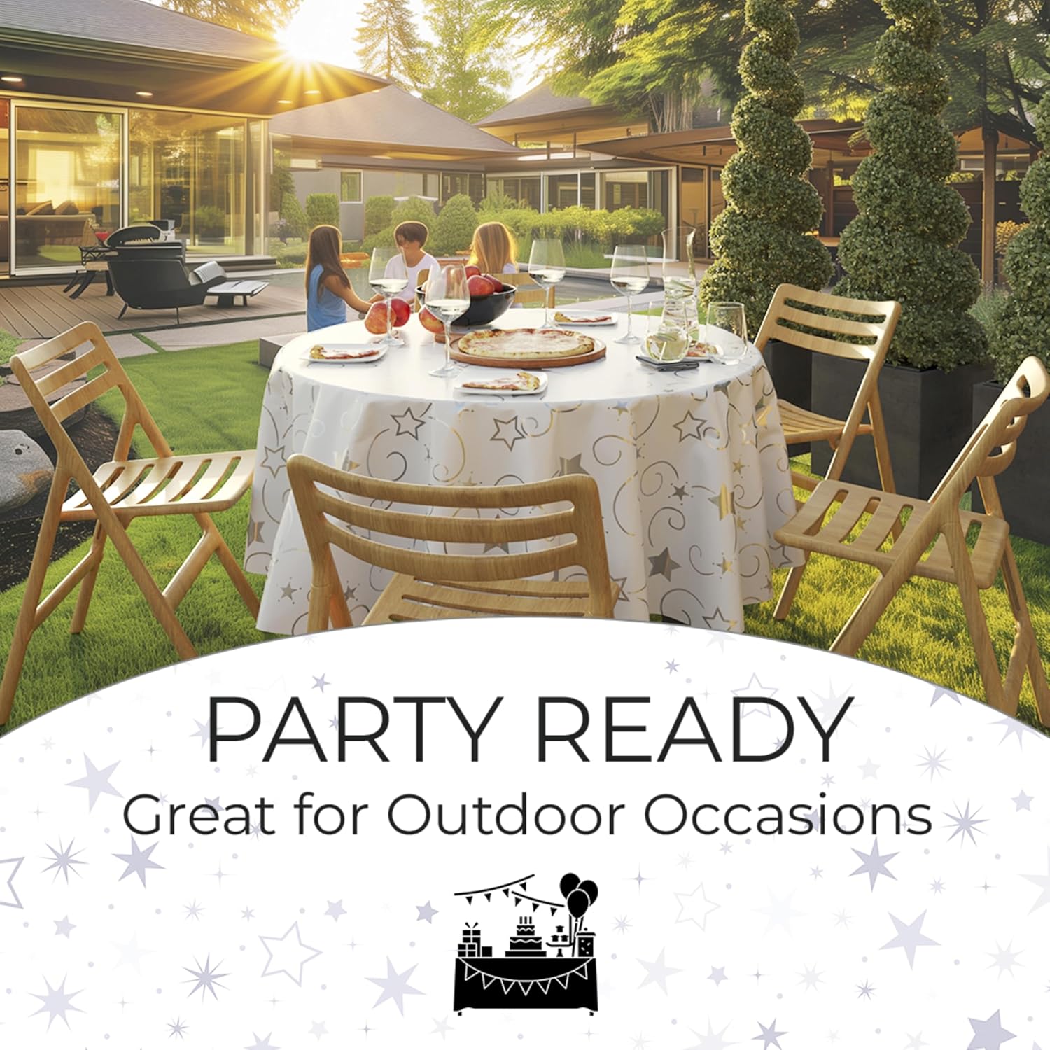 • Original Design: This Silver Star Table Cloth features a classic Star Table Cloth pattern that adds charm to any event. These round Table Covers are the perfect plastic tablecloths for round tables, enhancing your decor while protecting your surfaces.