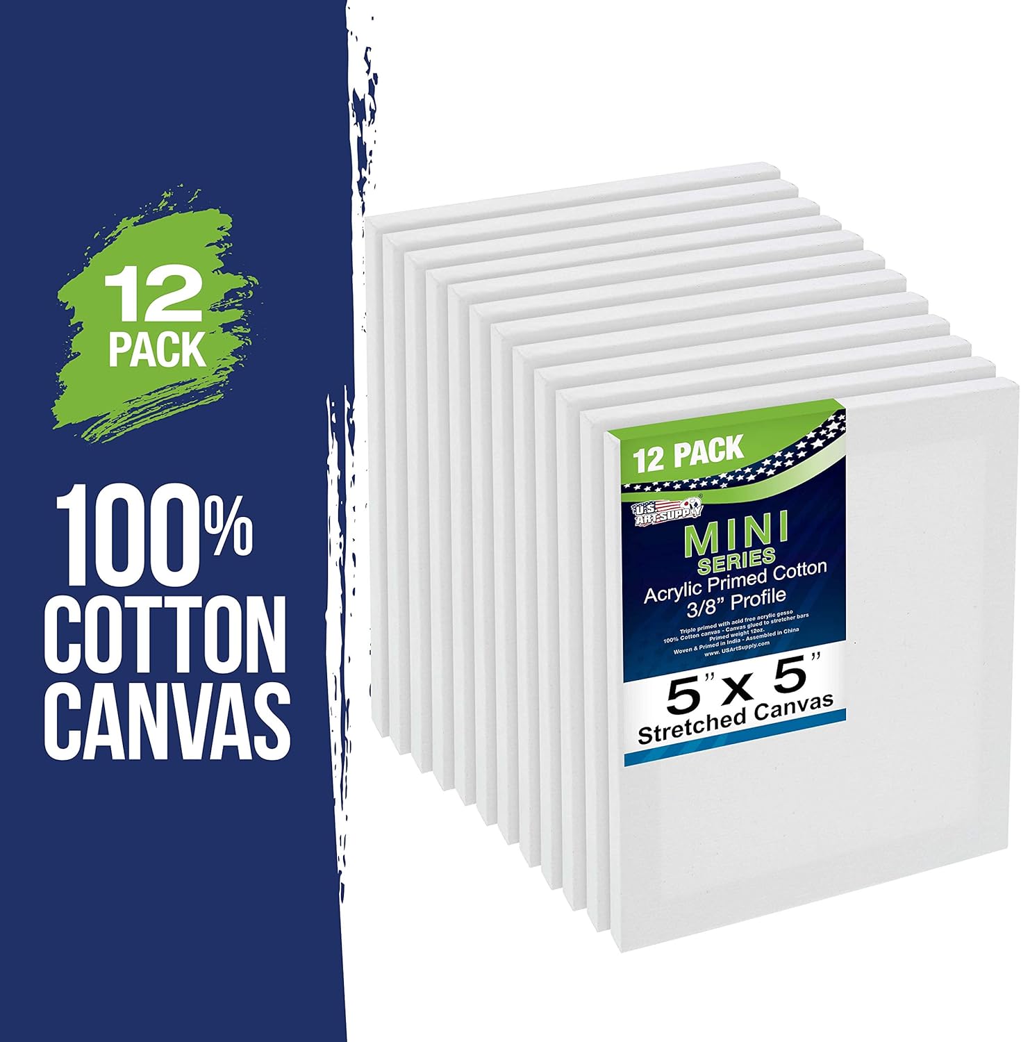 U.S. Art Supply 5" x 5" Stretched Canvas with 8" High Small Natural Wooden Easel (12 Pack), A-Frame Canvas Stand Tripod, Small Painting Easels - Tabletop Easel for Painting, Canvases, Student Crafts