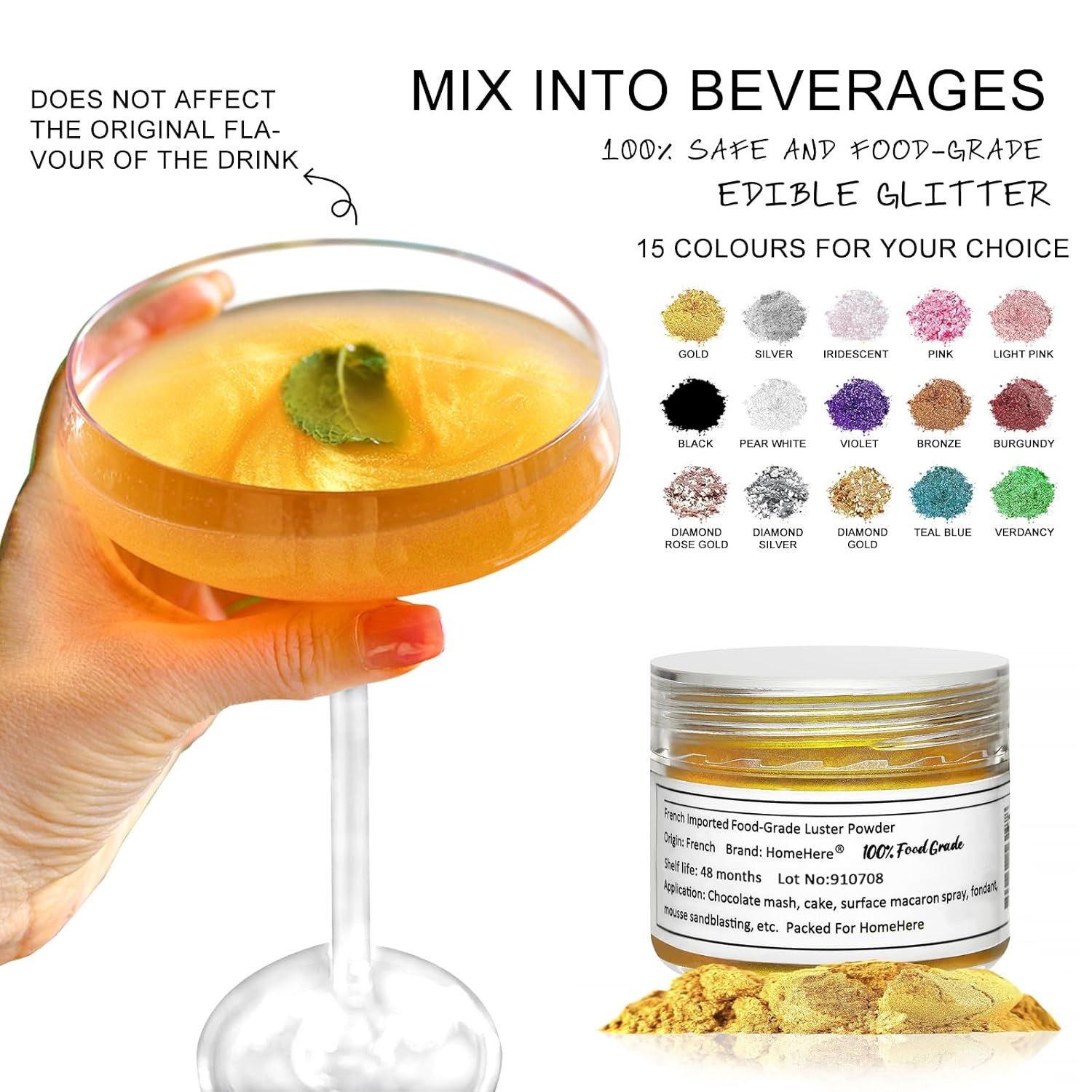 • EASY TO USE: Add edible dust directly to the surface being decorated, or use the luster of edible dust with alcohol (vodka is recommended) or an alcohol-based extract like lemon extract for a matte effect. It only takes a few drops and mixes until the luster dust has the consistency of paint. You can also DIY all kinds of shiny drinks, just add a little edible shine to your drink and you will have a glamorous cocktail, champagne, or any drink that everyone exclaims for you!