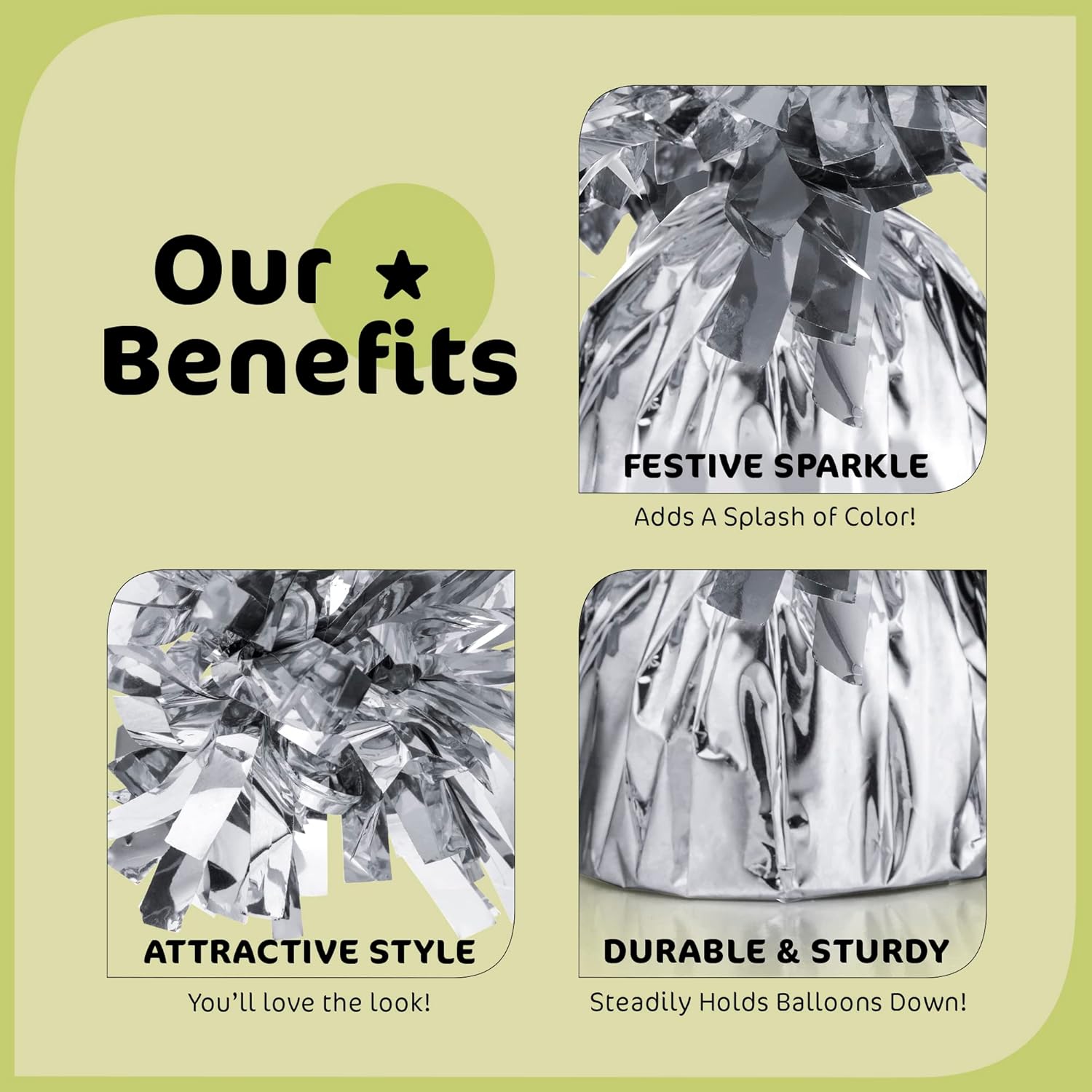 • How To Easily Attach Your Ballons: In the center of the top frills of each silver balloon weight, you will find a hidden metallic twist tie loop, that is blended into the frilly design. Just tie the ribbon of your balloon to that loop and you’re ready to use it as a table centerpiece or party decor!