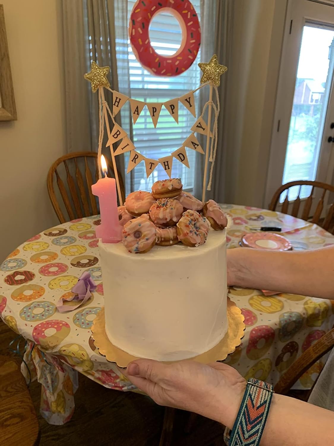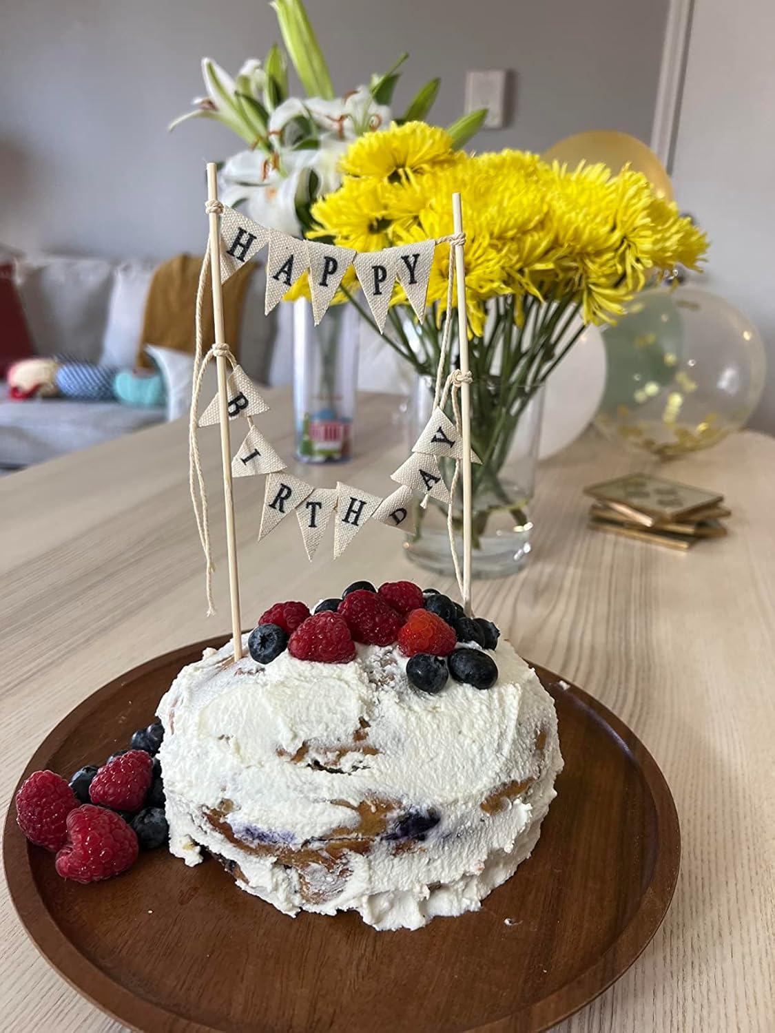 Happy Birthday Cake Bunting Topper Cake Topper Garland, Handmade Pennant Flags with Wood Pole Ivory (Without Pink Rose)