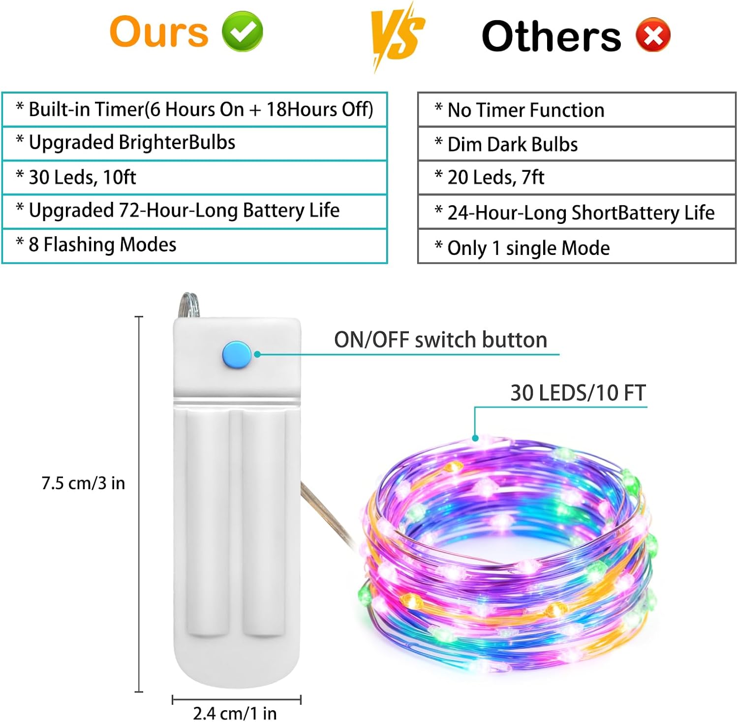 • 10 Pack Ultra-Bright LED Battery Powered Fairy Lights:10 pack 30 LED lights with a total wire length of 10 feet. Each fairy lights is composed of 30 super bright LED bulbs, each bulb spacing of 5 inches, emit 2700k multi-color light, bring a romantic atmosphere to your bedroom, garden, its battery box size of 2.95*0.9 inches;