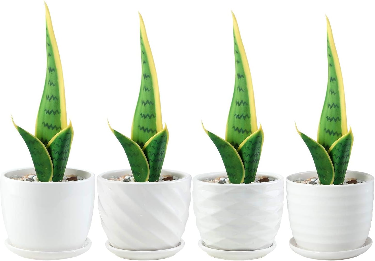 Plant Pots - 4.7 Inch Cylinder Ceramic Planters with Connected Saucer, Pots for Succuelnt and Little Snake Plants, Set of 4, White