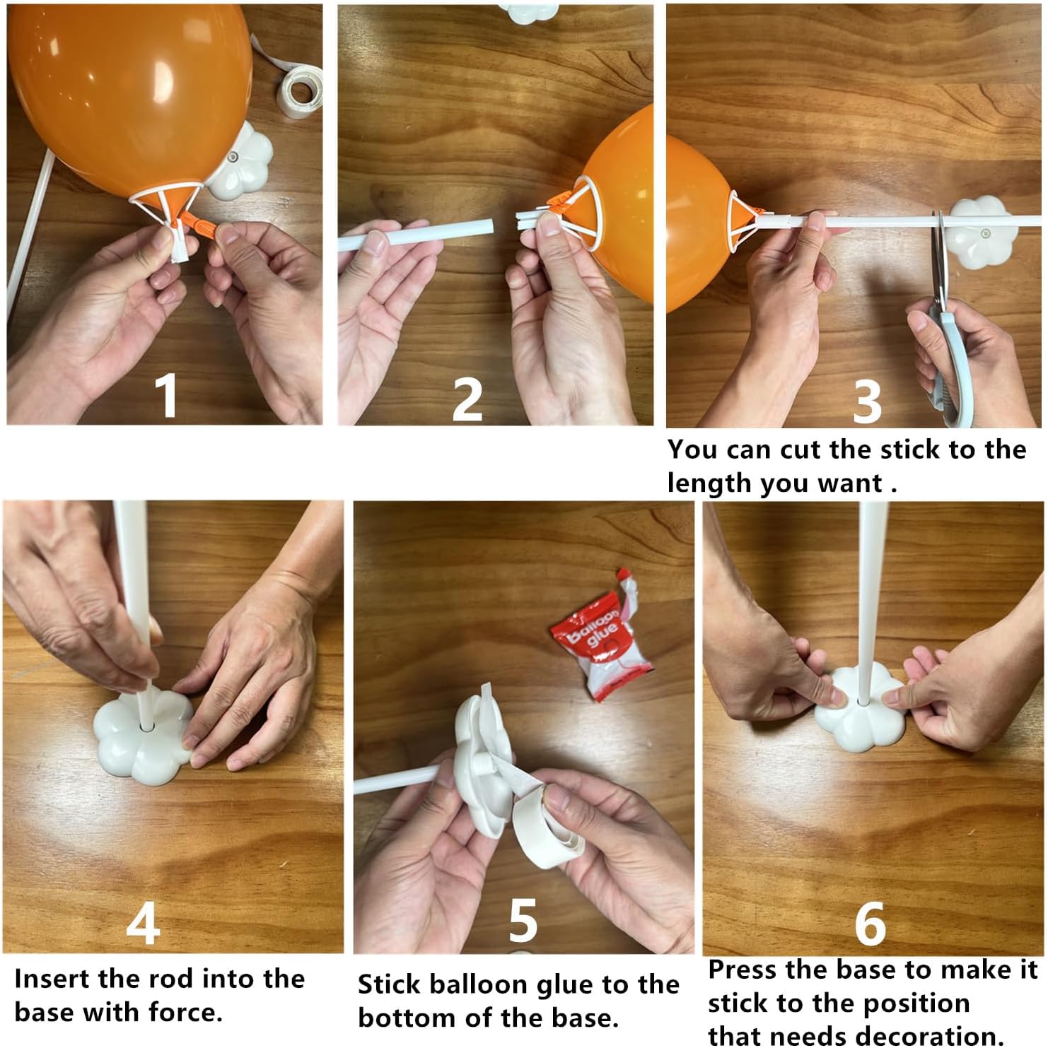 • Easy to Assemble : You can assemble one balloon column stand in 2 minutes as follow the picture 3, please insert the rod into the base with force and stick balloon glues to the bottom of the base, to make it stand firm.