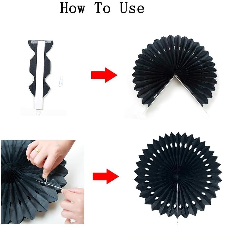 • Guideline: Simply clip each black and white hanging paper fan into a round shape and hang with the included strings. Cut the black and white garland to fit your space—ideal for themed parties, event venues, home decor and offices.
