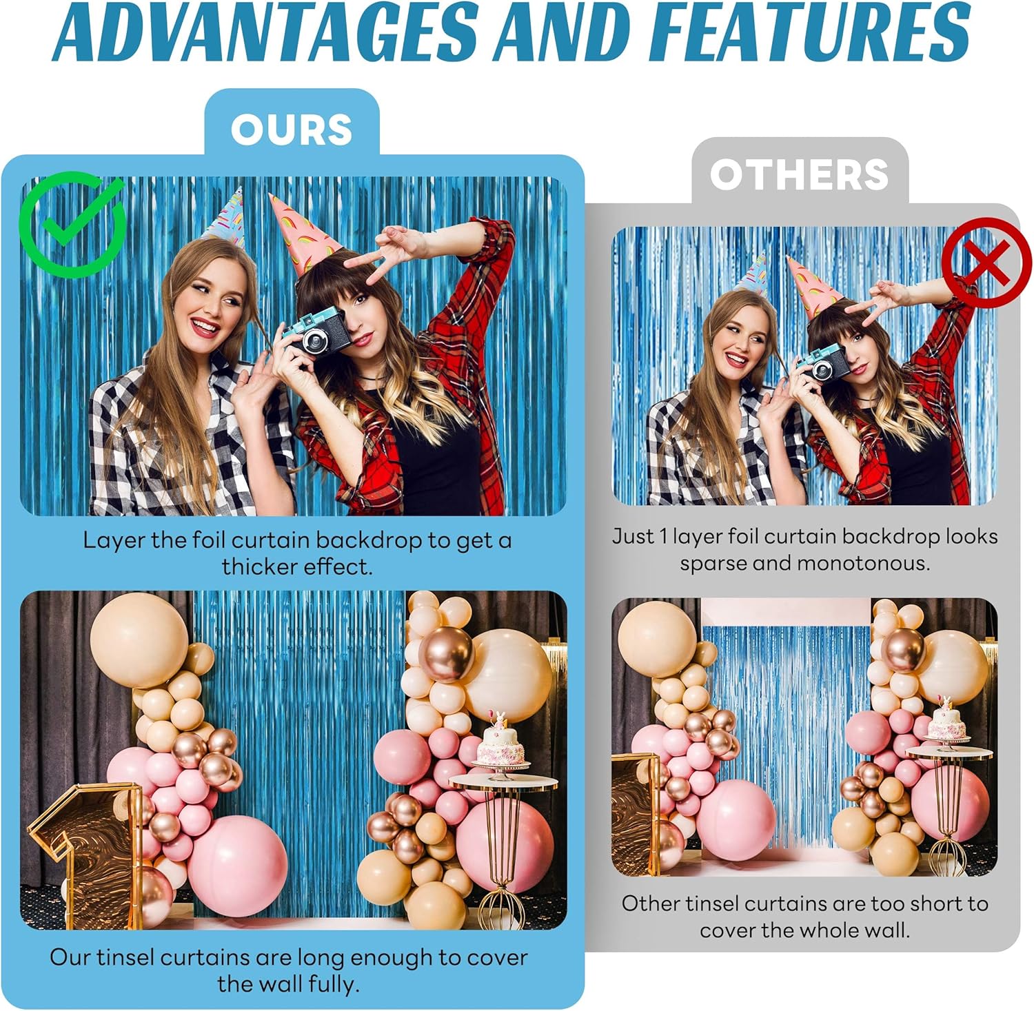 • Package contents:4 x aquamarine foil curtains; Size (wide x drop):3 x 8 feet, wonderful accessories for decorating doors and walls