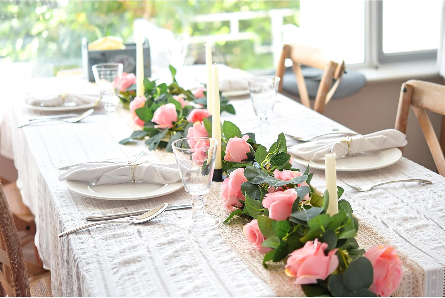 • Each strand has integrated loops at both ends for easy hanging—use individually or connect for a full-length display; Roses and leaves are made from soft silk blend with flexible PE vine; Color may vary slightly under lighting or monitor settings; Garlands may arrive compact due to packaging—please fluff gently to restore volume; Petal shedding may occur during unpacking and is normal; Ships in protective FiveSeasonStuff branded packaging.