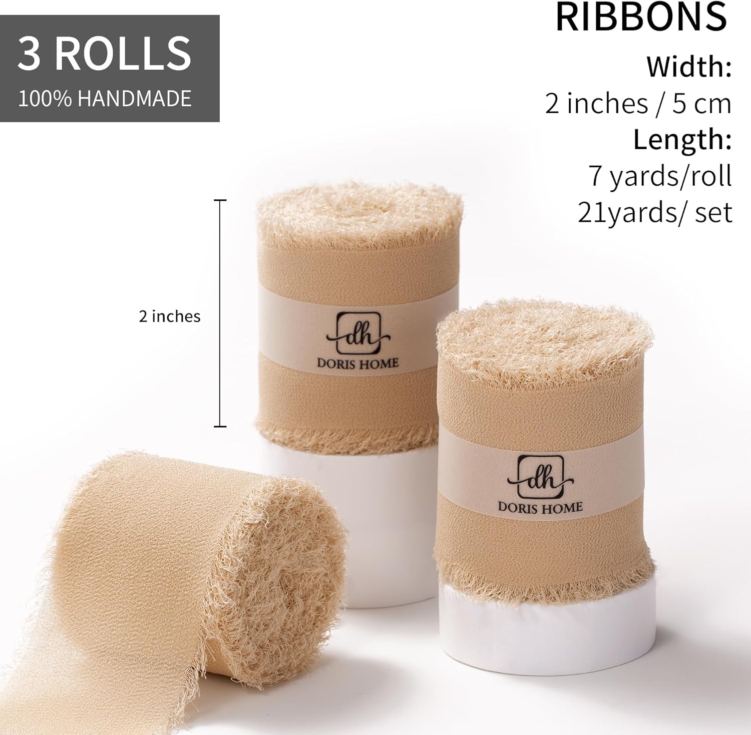 • 【Size and Color】Each roll of chiffon ribbon is 2 inches wide and 7 yards long, perfect for various creative uses such as making bows, decorating wreaths, and DIY crafts. This set includes 3 rolls nude ribbons. These vibrant frayed ribbons add a rustic charm to your creations, ideal for bouquet wrap or gift ribbon.