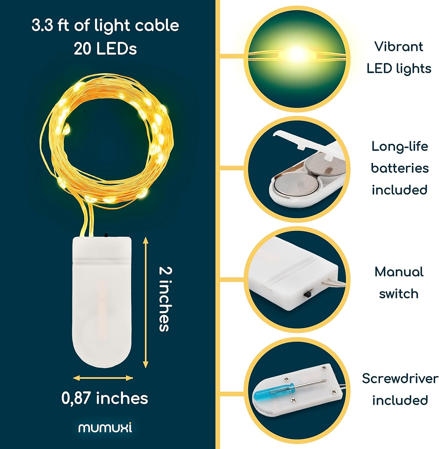 • Easy To Use & Safe To Touch - Each of our products is high quality at Mumuxi and this one is no exception. Save time and effort with replaceable batteries and a tiny on/off switch to turn them on for parties and switch ‘em off when everyone leaves. Incredibly low voltage makes these mini lights super safe in your home or place of work and carries no risks.