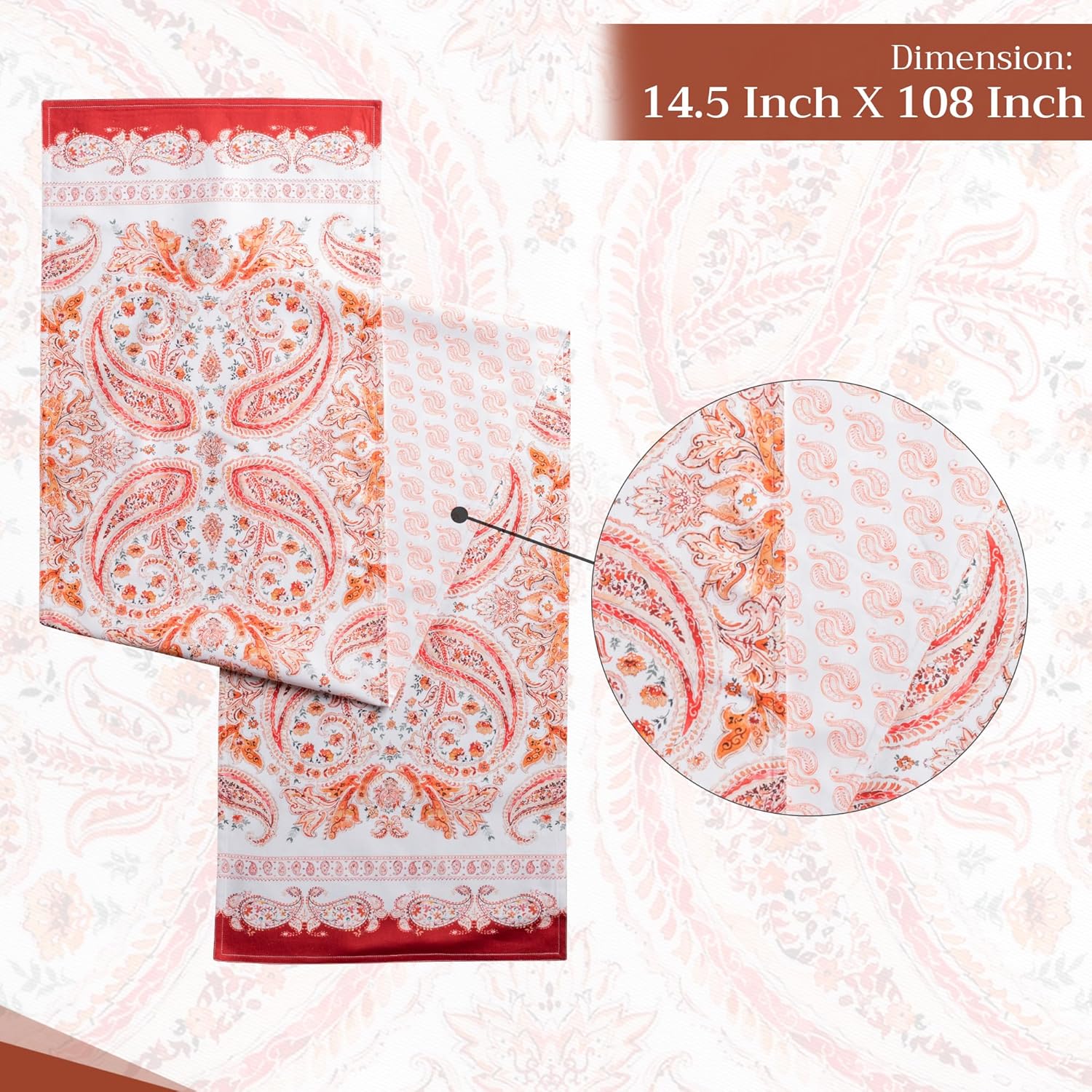 • Package Includes: 1 table runner measuring 14.5" x 108", made from 100% cotton. Ideal for banquet tables, dining tables, or adding a spring, Thanksgiving, or Christmas touch to your party decor. This 108-inch table runner brings unique charm to both casual and festive settings