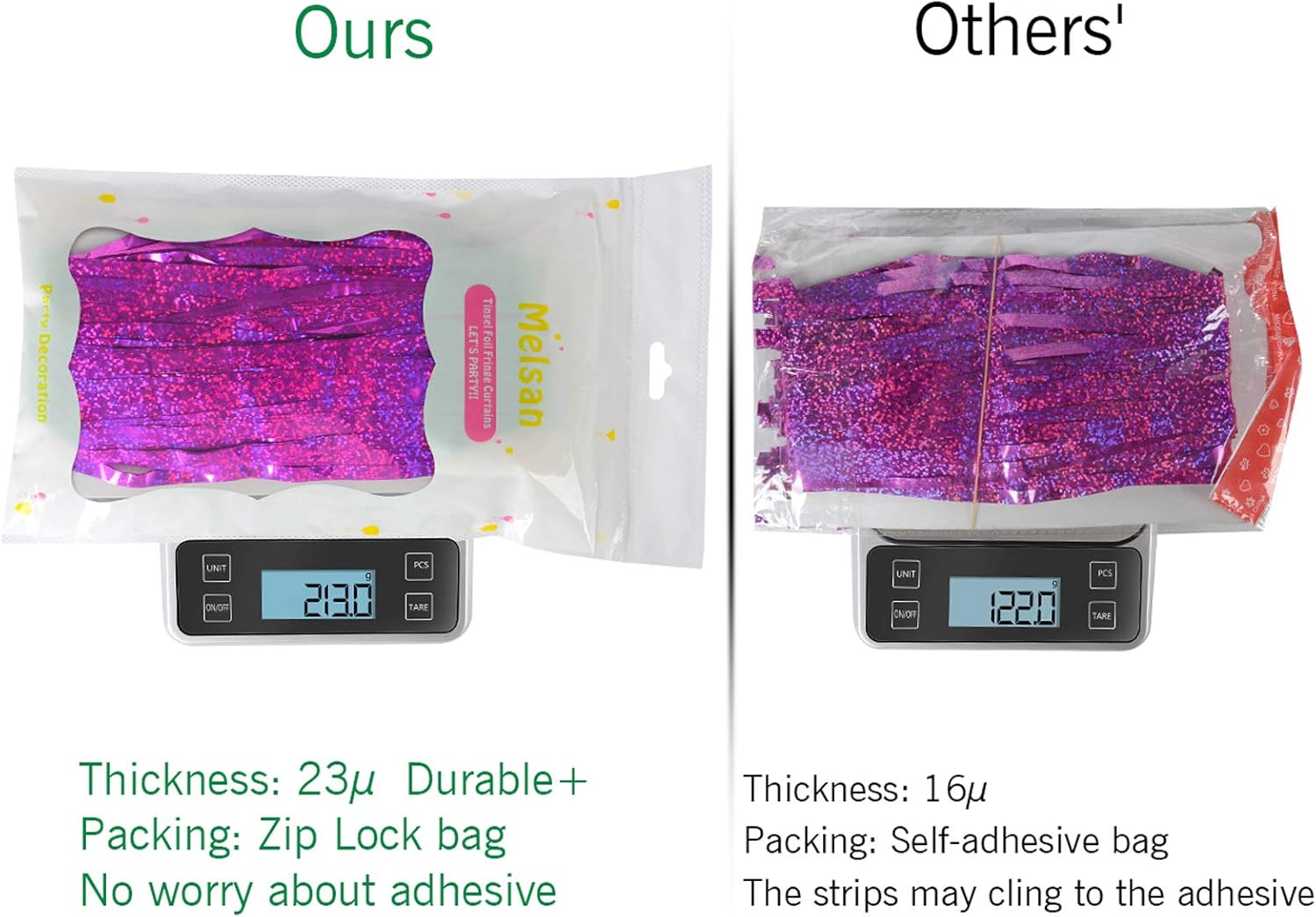 • The size of each metallic tinsel foil fringe curtain is 3.2 feet wide and 8 feet long, Package include 2 pack foil fringe curtains, suitable for hanging on a door or coverage a wall fully