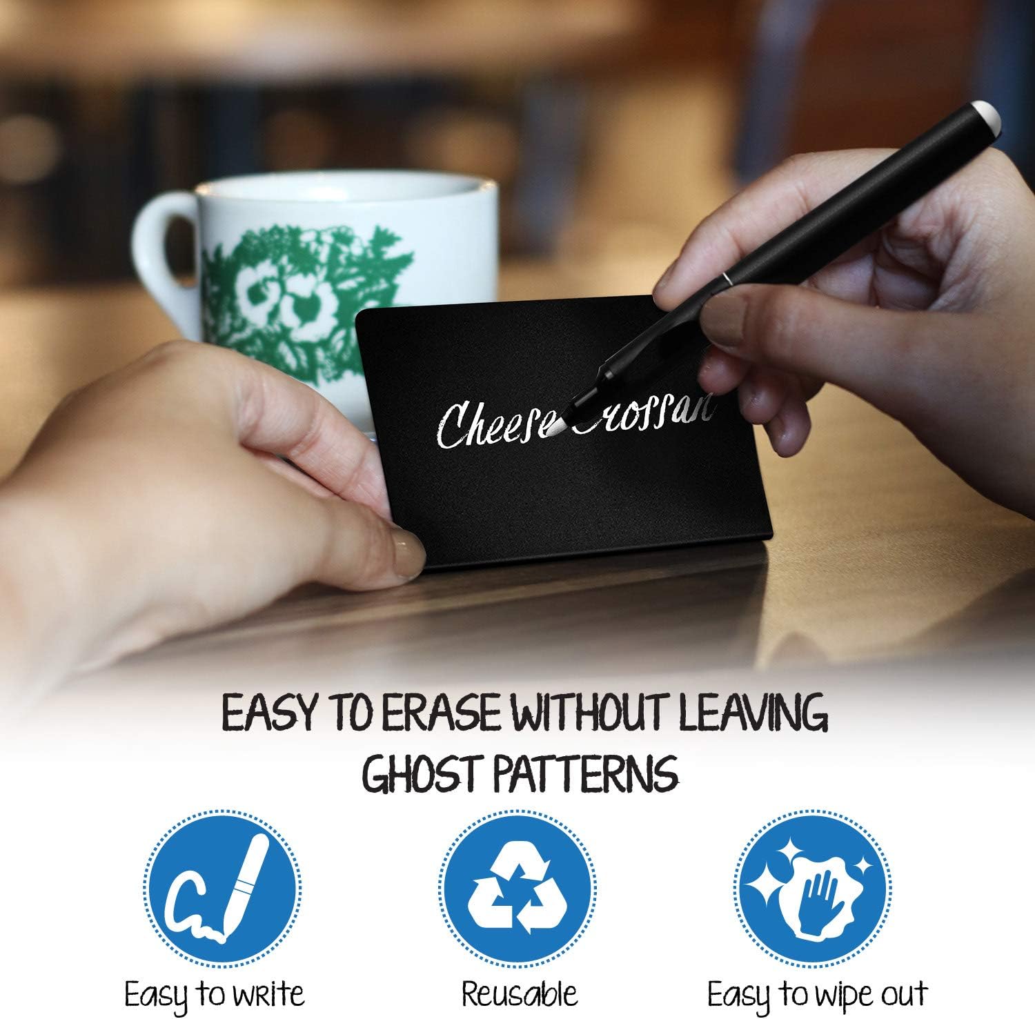 • πŸ”Ή Use Chalk Marker or Permanent Marker – Easy to Clean: Write with chalk markers or permanent markers β€” traditional chalk not recommended. Wipe chalk marker with a wet napkin or eraser, and clean permanent ink with a cloth and window cleaner.