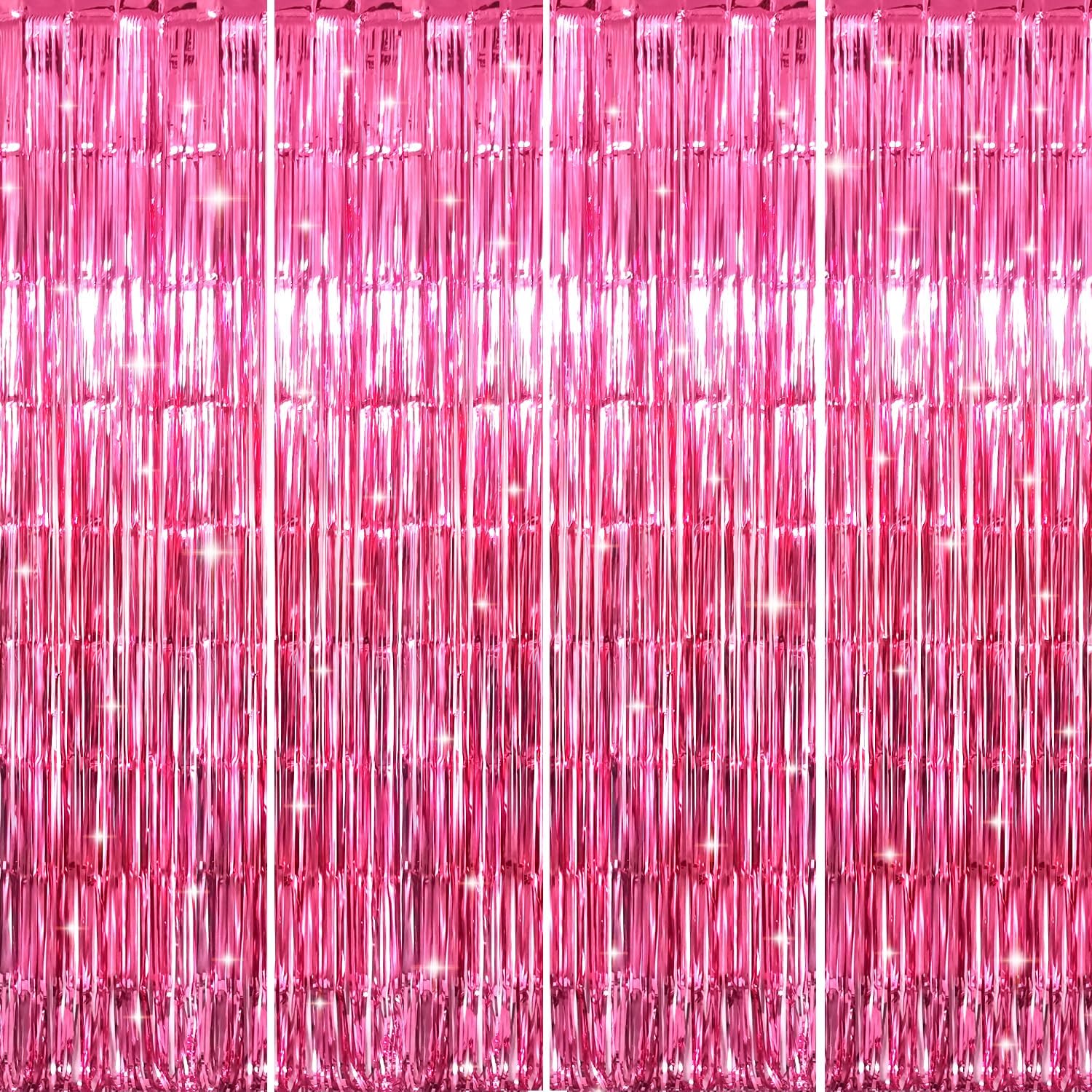 GOER 3.2 ft x 8.2 ft Metallic Tinsel Foil Fringe Curtains Party Photo Backdrop Party Streamers for Galentines Day,Birthday,Graduation,New Year Eve Decorations Wedding Decor (4 Packs,Hot Pink)