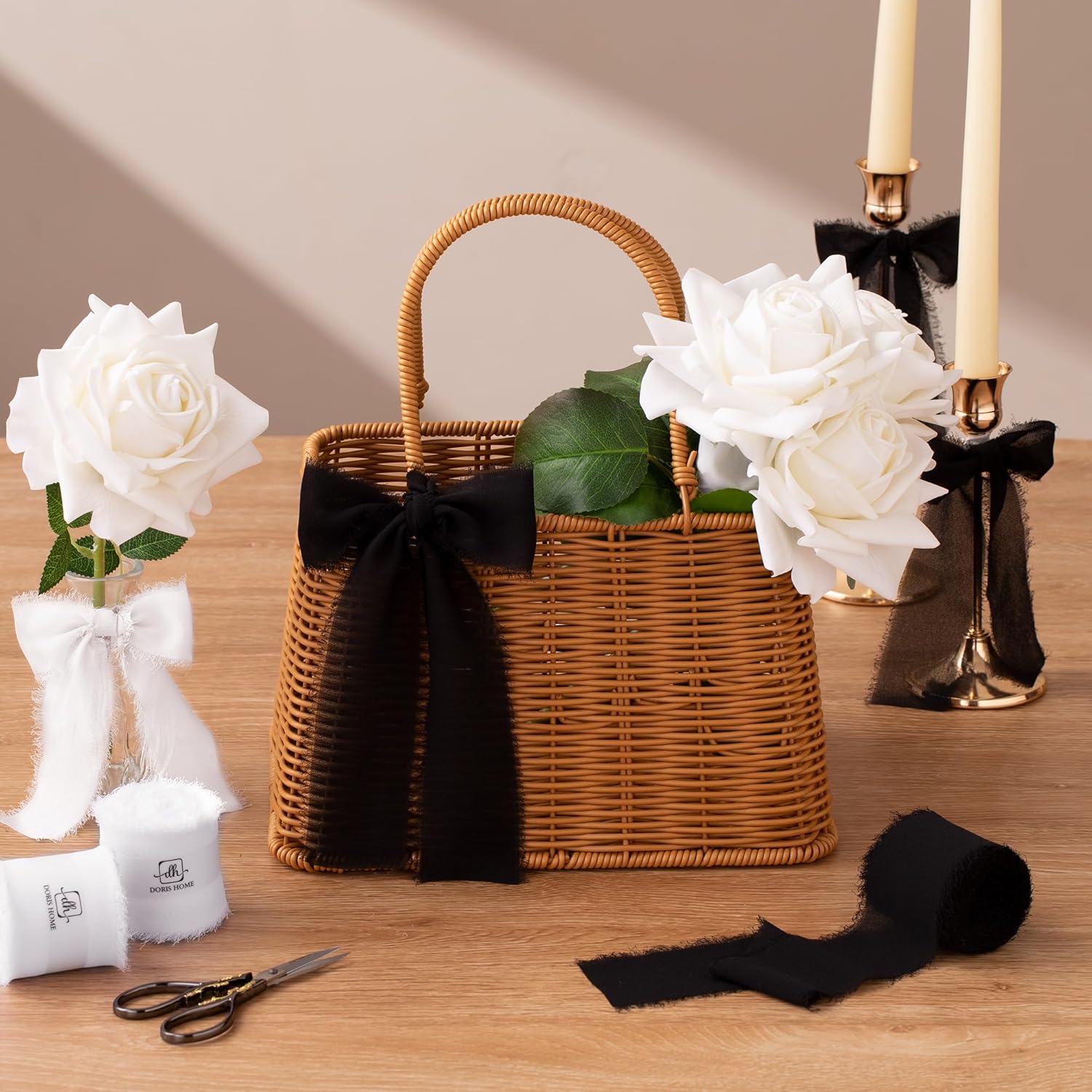 • 【Size and Color】Each roll of chiffon ribbon is 2 inches wide and 7 yards long, perfect for various creative uses such as making bows, decorating wreaths, and DIY crafts. This set includes 3 rolls black ribbons. These vibrant frayed ribbons add a rustic charm to your creations, ideal for bouquet wrap or gift ribbon.