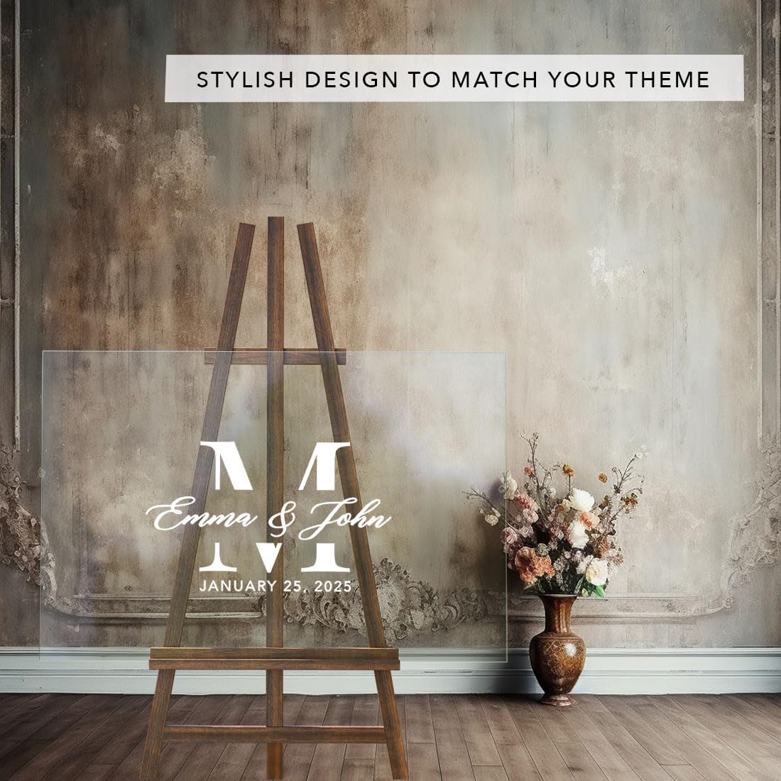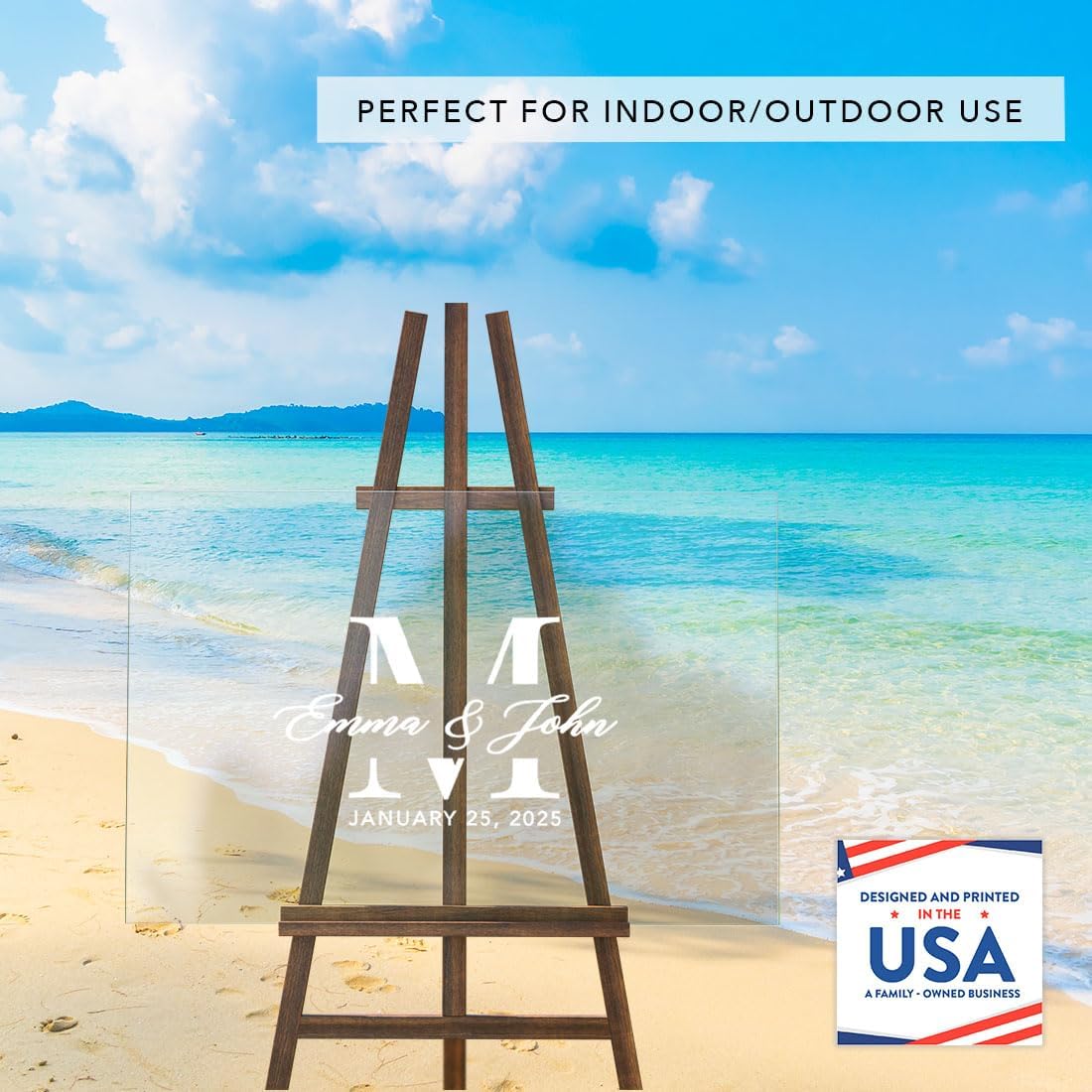 • VERSATILE DISPLAY OPTIONS Your custom names and date are directly printed onto durable acrylic with premium fade-resistant inks. Your sign is peel-proof and smudge proof. Made in USA. Our wedding entrance sign fits all sturdy easels or stands, making this wedding welcome sign without stand perfect for both indoor and outdoor use.