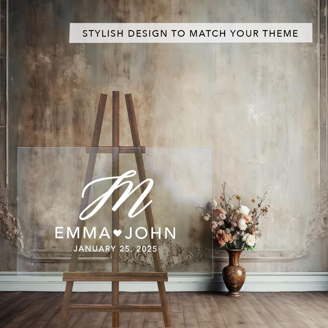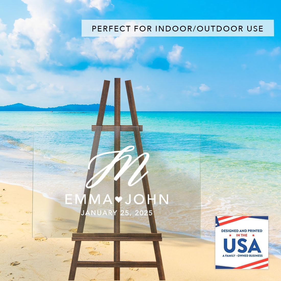 • VERSATILE DISPLAY OPTIONS Your custom names and date are directly printed onto durable acrylic with premium fade-resistant inks. Your sign is peel-proof and smudge proof. Made in USA. Our wedding entrance sign fits all sturdy easels or stands, making this wedding welcome sign without stand perfect for both indoor and outdoor use.