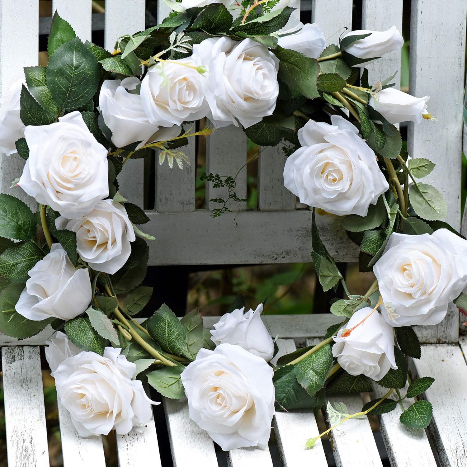• With FiveSeasonStuff's bendable silk artificial rose white flower garlands, you can create a gorgeous and beautiful area. Consisting of 10 rose heads in various bloom cycles, each lifelike garland is natural looking. Each artificial rose vine is made up of 4 large full flowers, 4 medium sized flowers and 2 rose buds. Rich petal layers, new shoots and detailed leaf textures make these rose garlands so realistic.
