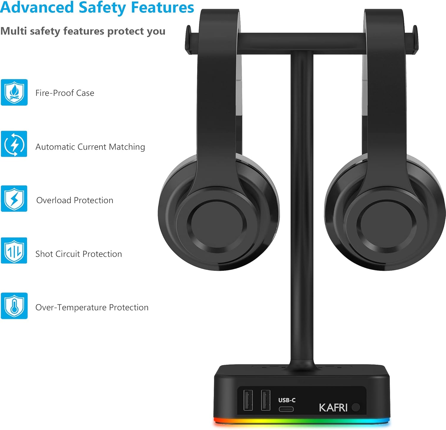 KAFRI RGB Dual Headphone Stand with USB C Charger Desk Gaming Double Headset Holder Hanger Rack with 3 USB Charging Port and 2 Outlet - Suitable for Gamer Desktop Table Game Earphone Accessories Gift