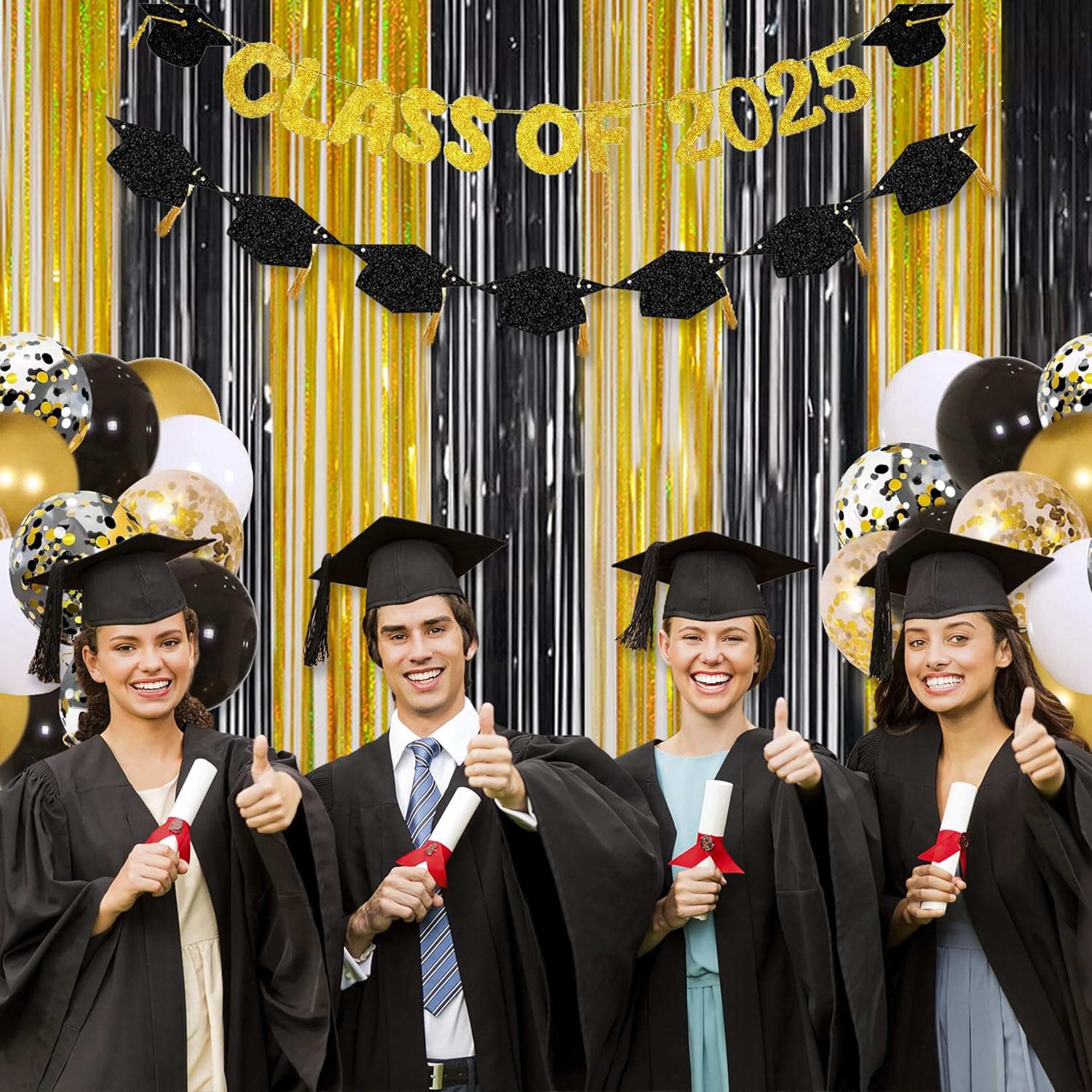 Foil Fringe Curtains Happy Retirement Decorations - Melsan 3 Pack 3.2 x 8.2 ft Gold Tinsel Curtain Party Photo Backdrop for Birthday Party Baby Shower or Graduation