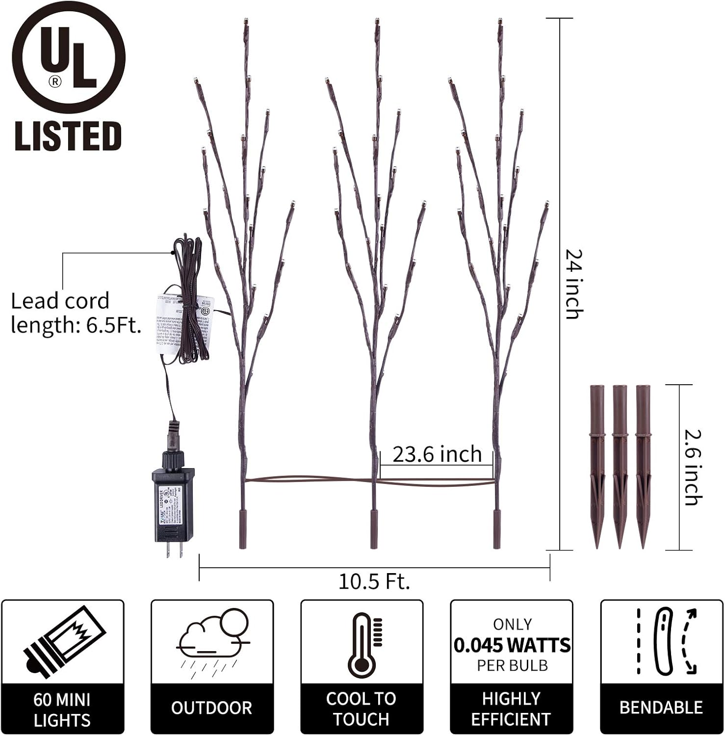 Lighted Branches for Vases Plug in - 3 Pack 24Inch 60 LED Christmas DIY Twig Pathway Lights, Artificial Tree Bendable Xmas Fairy Lights with Stakes for Outdoor Indoor Party Decoration, Multicolor