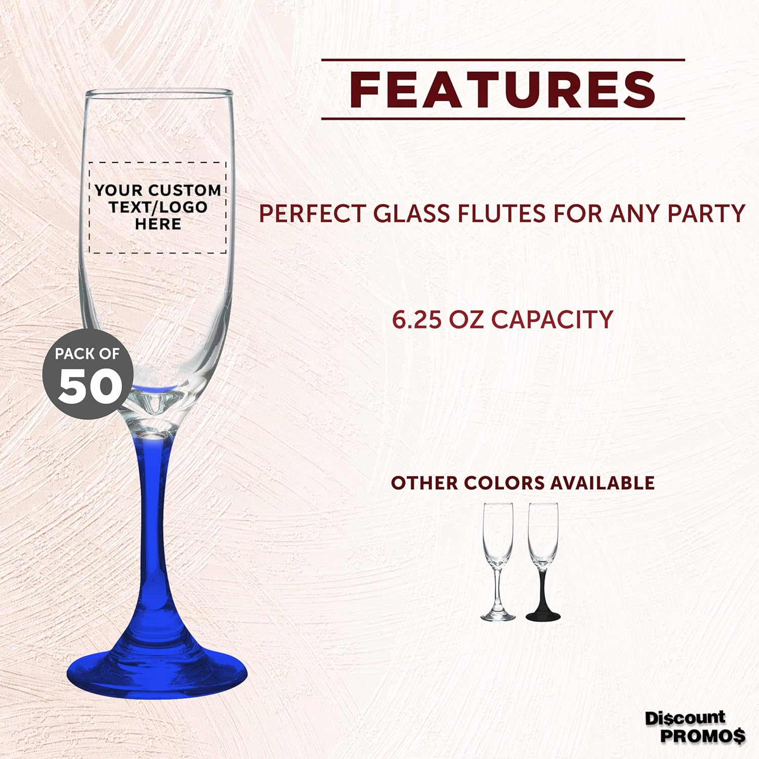 DISCOUNT PROMOS Custom Premiere Champagne Flutes 6.25 oz. Set of 50, Personalized Bulk Pack - Elegant Drinkware for Weddings, Events, & Promotional Gifts - Blue
