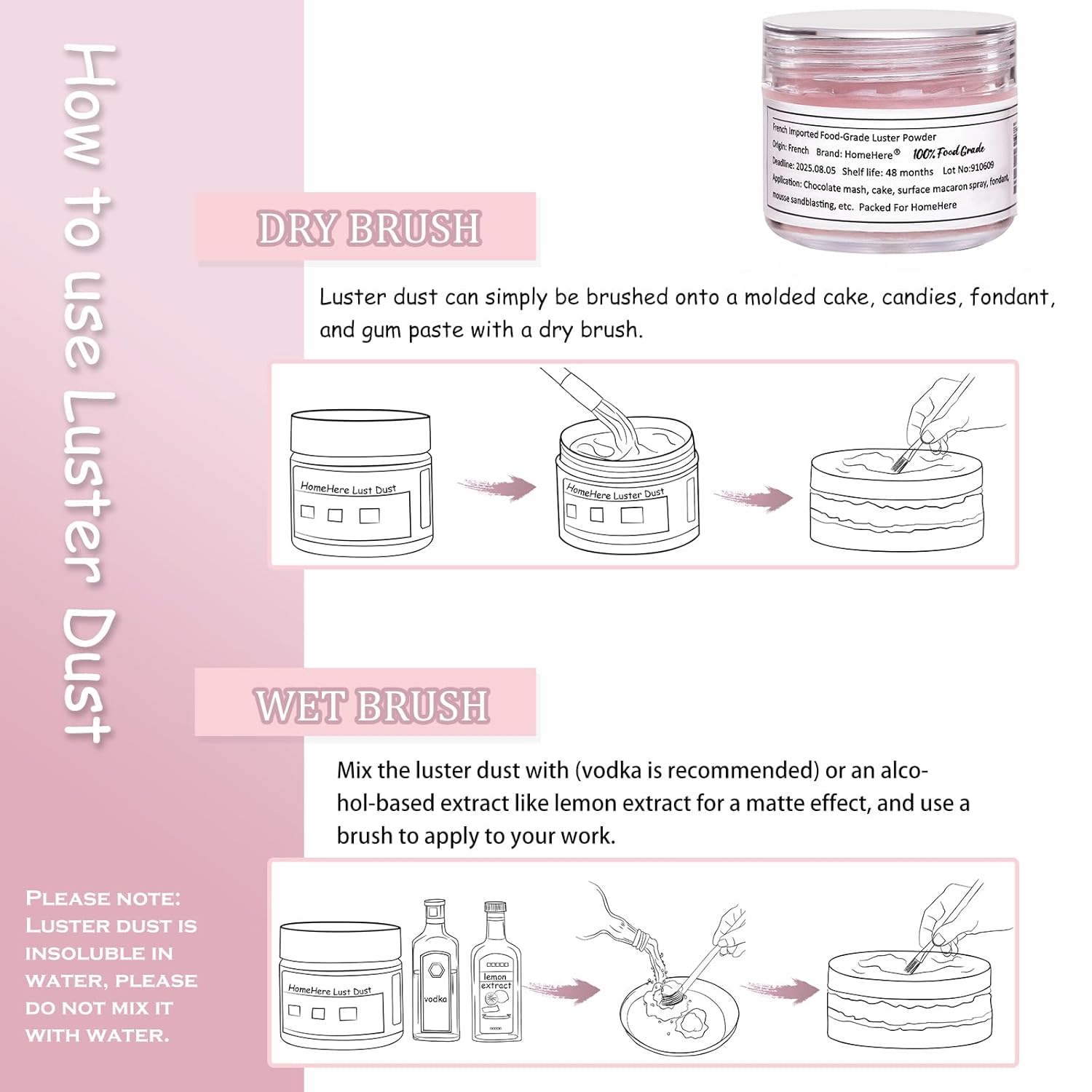 • EASY TO USE: Add edible dust directly to the surface being decorated, or use the luster of edible dust with alcohol (vodka is recommended) or an alcohol-based extract like lemon extract for a matte effect. It only takes a few drops and mixes until the luster dust has the consistency of paint. You can also DIY all kinds of shiny drinks, just add a little edible shine to your drink and you will have a glamorous cocktail, champagne, or any drink that everyone exclaims for you!