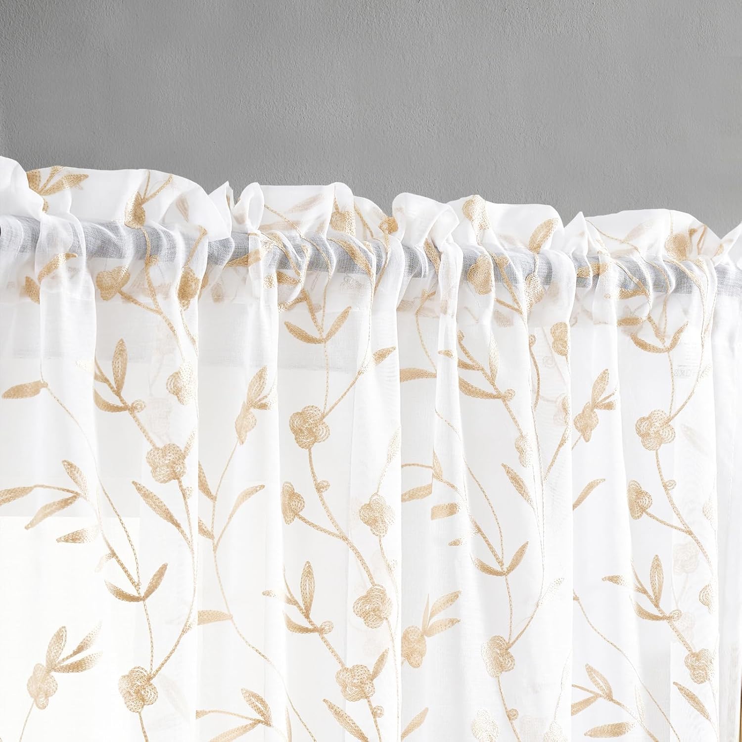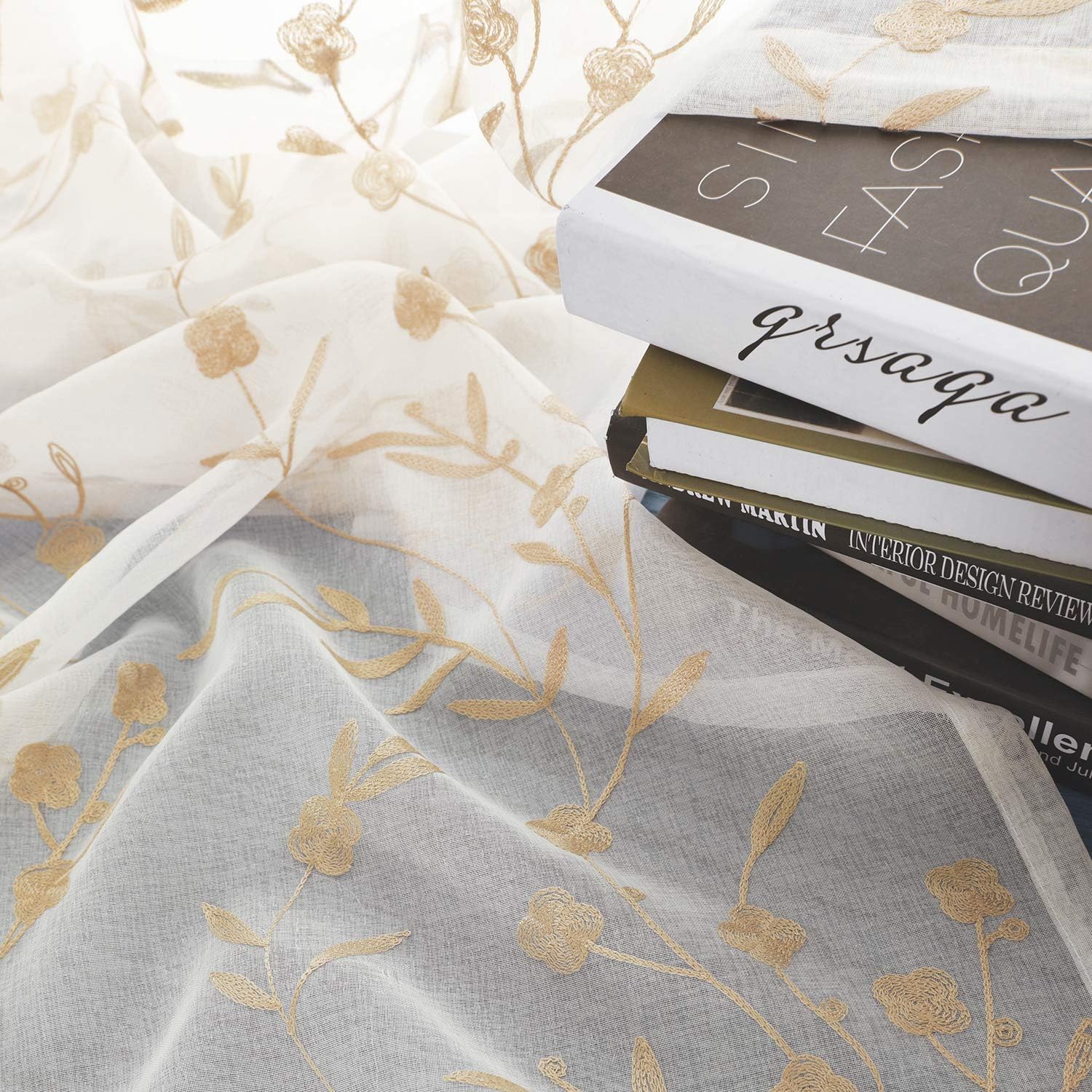 Sheer Curtains with Desin White-Beige Floral Embroidery 84 Inch Long Rod Pocket Lace Drapes for Living room, Bedroom, 2 Panels, 52"x84", Semi Voile Outdoor Window Treatment Sets for Yard, Patio.
