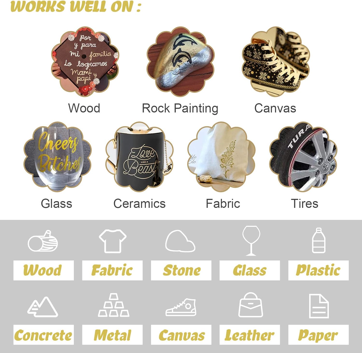 • 【Mark on Dark and Light Color Surfaces】Eye-catching metallic shining contrast color, polarized color under light. Suitable for leave message and permanent sign. Paint markers for rocks painting, fabric, ceramic, glass, wood, plastic, leather, canvas, mugs, blackboard almost any solid surface.