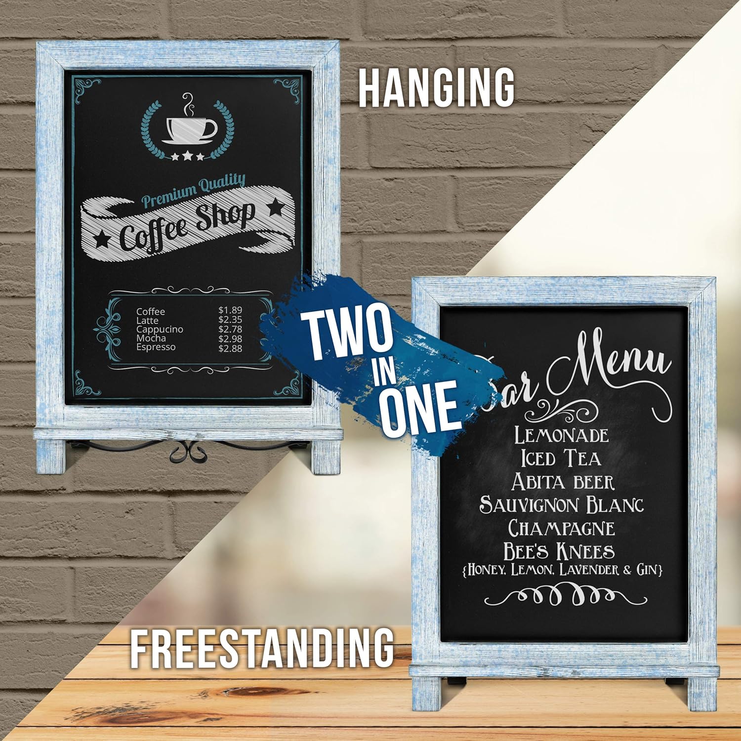 • VERSATILE DESIGN - Our small Chalkboard Easel was designed with maximum versatility. It can be used as a FREESTANDING chalkboard on tabletops or as a HANGING wall chalkboard. Our Patent Pending Design includes foldable metal legs and wall hanging hardware so its ready to use straight out of the box.