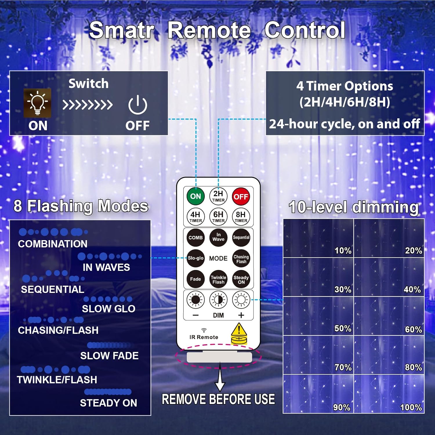 • 16.5 Ft Lead Wire: 300 individual LEDs, 9.8ft.x9.8ft curtains lights come with extra 16.5ft long power cord; 9.8ft main strand and 10 drop strings included hooks; Copper wire drop strings is tough and flexible, hanging and adjustable desired height naturally easily; No limits to your imagination, Do the shape you like; Enjoy a fairytale world (Curtain is NOT included)