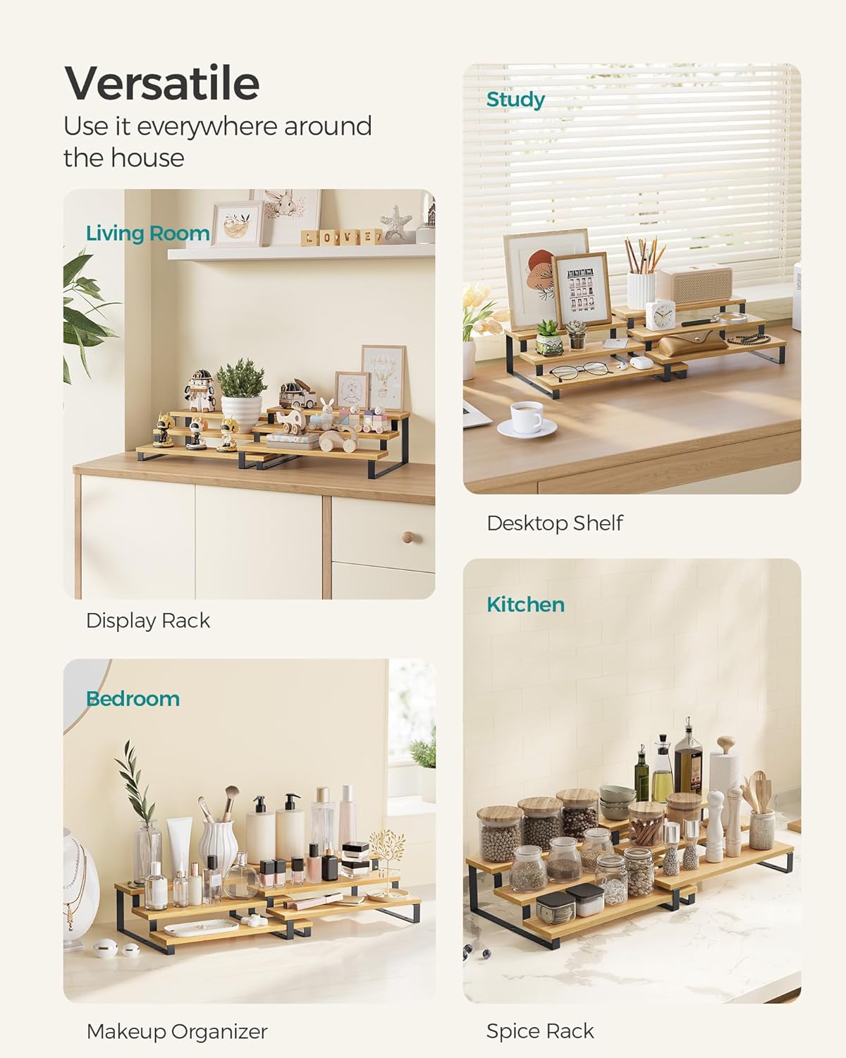 • 【VERSATILE】This 3-tier spice shelf is perfect for home use or store displays. Use it on countertops, dining tables, vanities, or in cabinets for showcasing condiments, desserts, perfumes, cosmetics, or collectibles