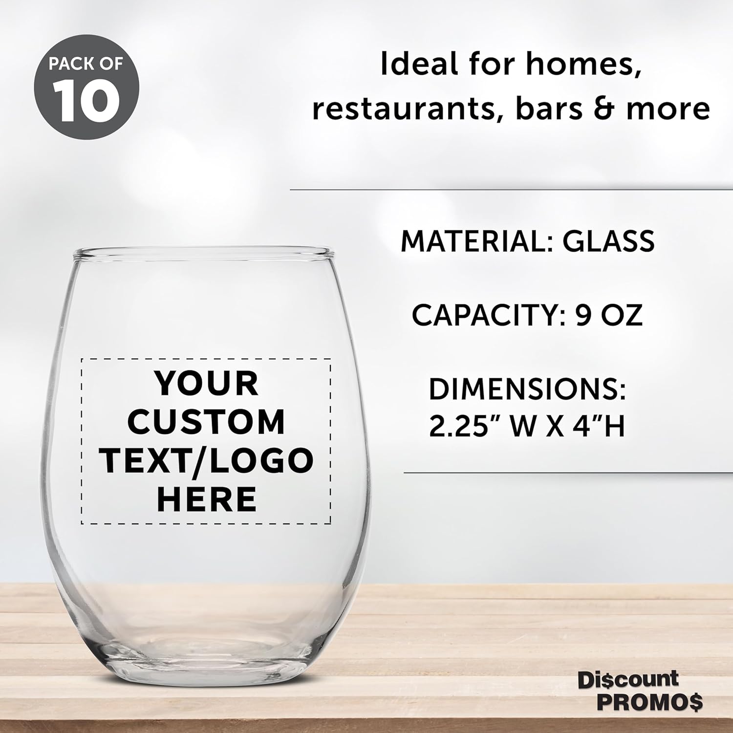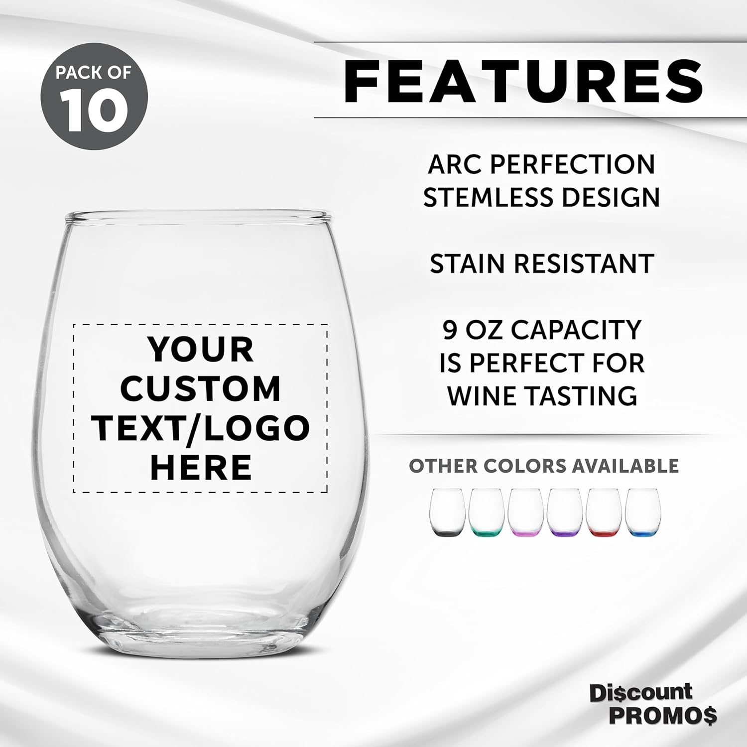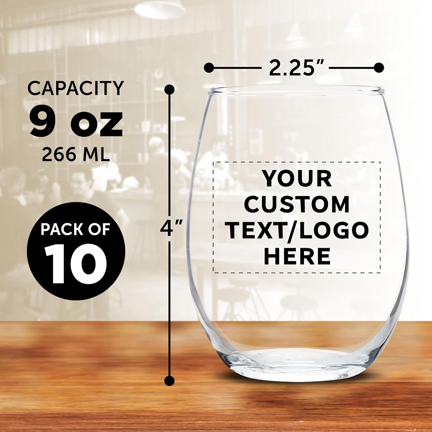 Custom Stemless Wine Glass 9 oz. Set of 10, Personalized Bulk Pack - Great for Wedding Favors, Bachelorette Party Decorations, Party Favors, Color Bottom - Clear