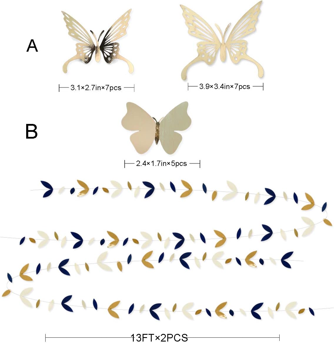 • Package Contains - 2×blue gold leaves garlands,8×paper flowers pom poms,3×paper lanterns,24×champagne gold butterfly decals stickers,3×royal blue ribbon.Total 40 pcs.