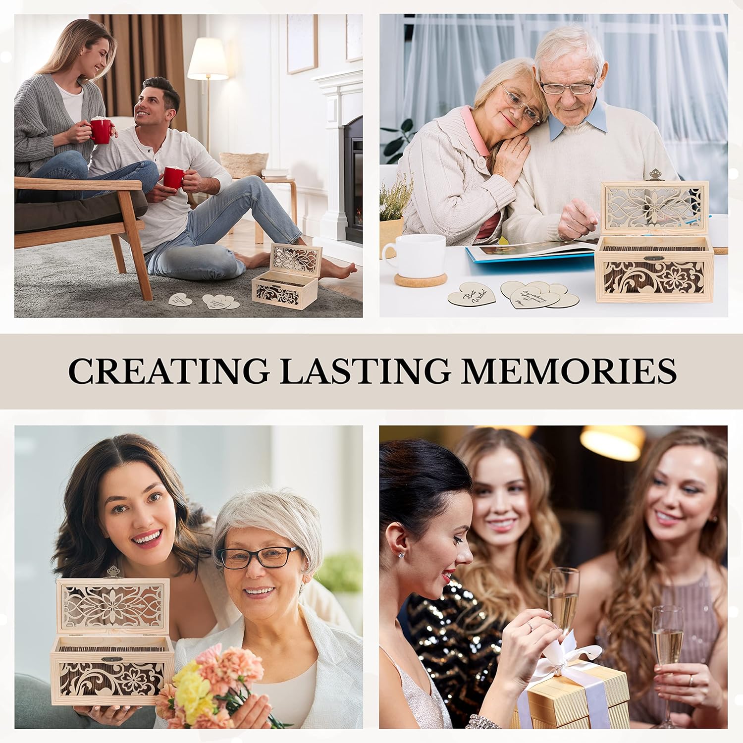 • 🔸 Hand Made High Quality - Hand crafted in Vietnam. Solid Pine Wood Box 8" Length X 4" Width X 4" Depth. 62 X 3.1" large laser cut hearts for your guests to sign. Display sign: 3.5" heart + 2" block stand. A lifetime of memories.