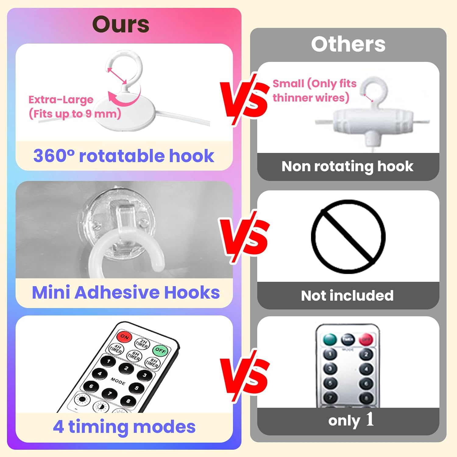 • 360°Rotatable Hooks: Upgrade 360°Rotation Clips on each drop string is mainly used for hooking on curtains; It can be hung at any angle, such as on wall, window or other surface; Also includes 16 sets of Damage-free adhesive hooks; No nails needed and holds strongly and removes cleanly; Both of these two clips make the curtain light easily to be hung for some special places, not only limited to windows, but also can be hung on flat walls, glass, porches, eaves, etc